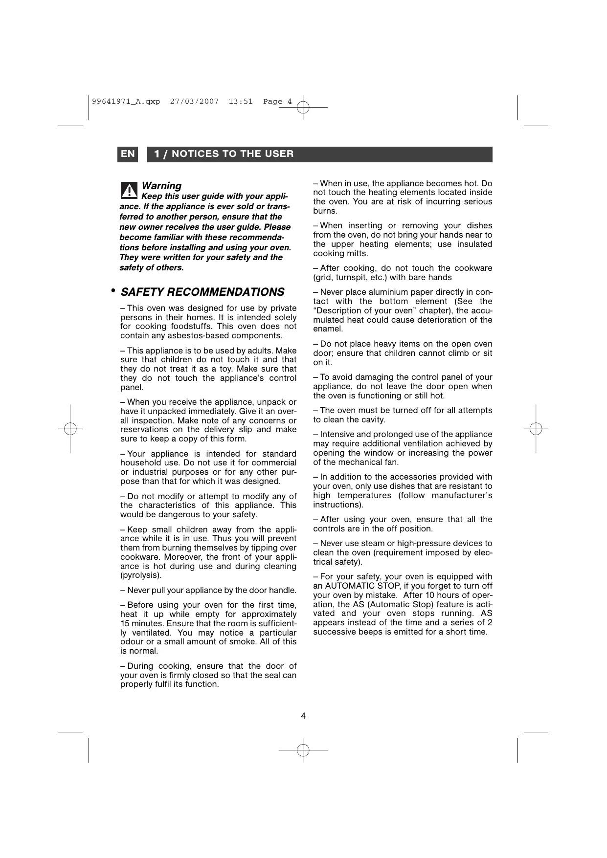 - SAFETY RECOMMENDATIONS — Never place aluminium paper directly in contact with the bottom element (See the “Description of your oven” chapter), the accumulated heat could cause deterioration of the enamel. — This oven was designed for use by private persons in their homes. It is intended solely for cooking foodstuffs. This oven does not contain any asbestos-based components. — Do not place heavy items on the open oven door; ensure that children cannot climb or sit on it. — This appliance is to be used by adults. Make sure that children do not touch it and that they do not treat it as a toy. Make sure that they do not touch the appliance’s control panel. — To avoid damaging the control panel of your appliance, do not leave the door open when the oven is functioning or still hot. — When you receive the appliance, unpack or have it unpacked immediately. Give it an overall inspection. Make note of any concerns or reservations on the delivery slip and make sure to keep a copy of this form. — The oven must be turned off for all attempts to clean the cavity. — Intensive and prolonged use of the appliance may require additional ventilation achieved by opening the window or increasing the power of the mechanical fan. — Your appliance is intended for standard household use. Do not use it for commercial or industrial purposes or for any other purpose than that for which it was designed. — In addition to the accessories provided with your oven, only use dishes that are resistant to high temperatures (follow manufacturer’s instructions). — Do not modify or attempt to modify any of the characteristics of this appliance. This would be dangerous to your safety. — After using your oven, ensure that all the controls are in the off position. — Keep small children away from the appliance while it is in use. Thus you will prevent them from burning themselves by tipping over cookware. Moreover, the front of your appliance is hot during use and during cleaning (pyrolysis). — Never use steam or high-pressure devices to clean the oven (requirement imposed by electrical safety). — For your safety, your oven is equipped with an AUTOMATIC STOP, if you forget to turn off your oven by mistake. After 10 hours of operation, the AS (Automatic Stop) feature is activated and your oven stops running. AS appears instead of the time and a series of 2 successive beeps is emitted for a short time. — Never pull your appliance by the door handle. — Before using your oven for the first time, heat it up while empty for approximately 15 minutes. Ensure that the room is sufficiently ventilated. You may notice a particular odour or a small amount of smoke. All of this is normal. — During cooking, ensure that the door of your oven is firmly closed so that the seal can properly fulfil its function.