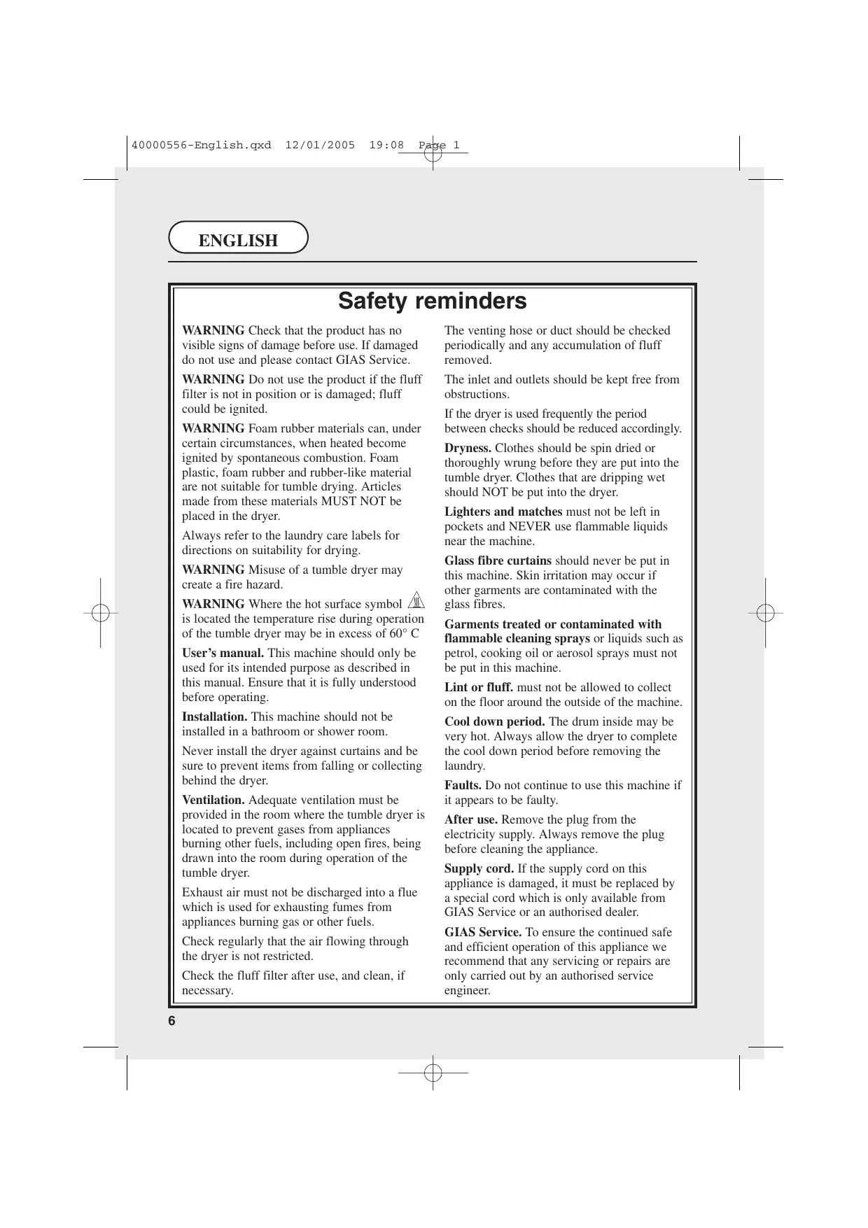 29 30 En cas de doute concernant l’installation, veuillez appeler le numéro de GIAS Service national pour obtenir des conseils. Avant d’utiliser le sèche-linge pour la première fois : ● veuillez lire ce manuel d’instruction en détail. ● retirez tous les articles qui se trouvent à l’intérieur du tambour. ● essuyez l’intérieur du tambour et de la porte avec un chiffon humide pour éliminer la poussière éventuelle qui aurait pu s’y infiltrer en transit.
