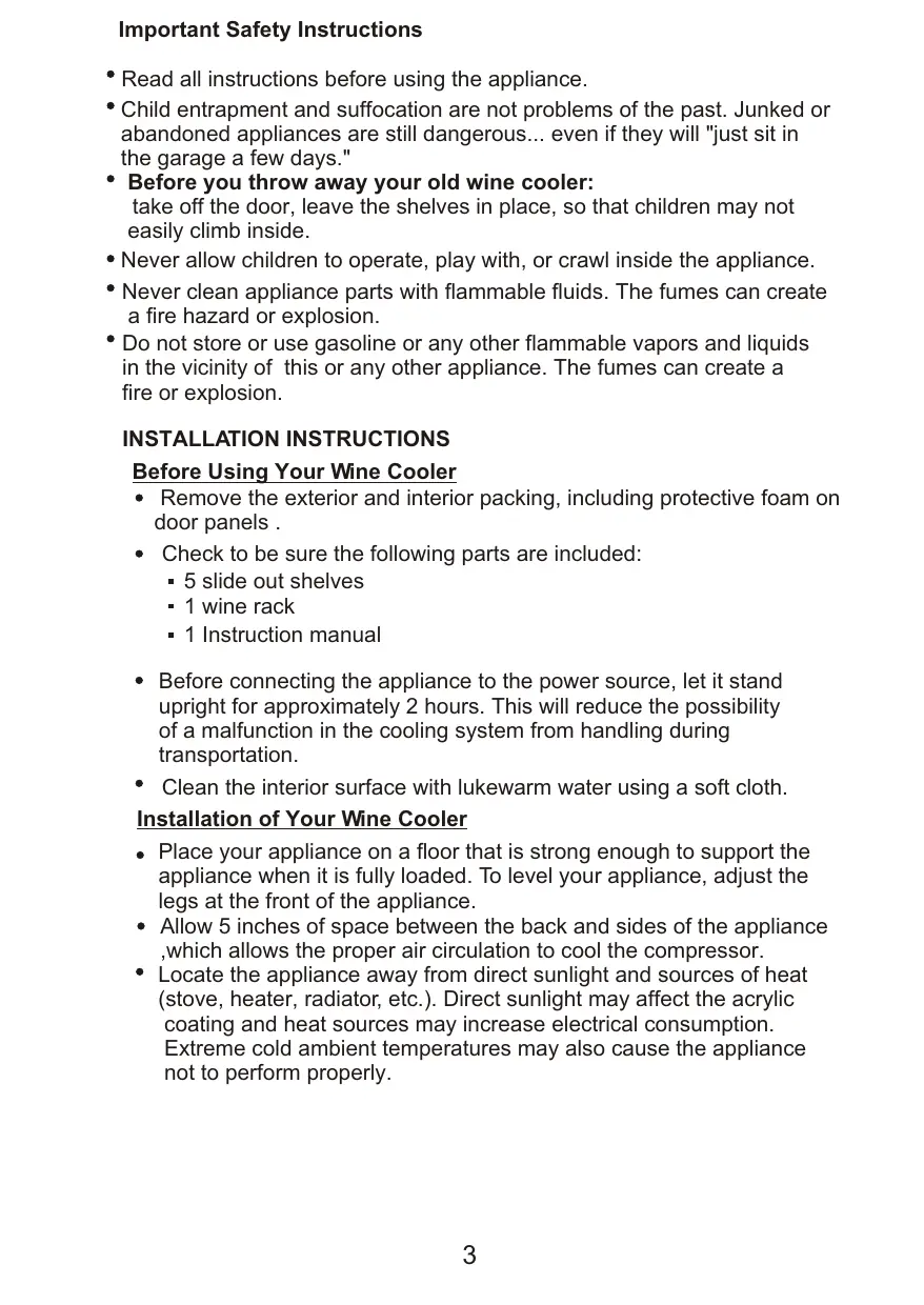 • Ne permettez pas à vos enfants d’utiliser l’appareil pour jouer ou pour s’y installer. • Ne nettoyez jamais l'appareil avec des liquides inflammables. Les gaz peuvent causer un incendie ou une explosion. • Ne conservez ni n’utilisez de l'essence ou autre matériau inflammable à proximité d’un appareil, celui-ci ou un autre. Les gaz peuvent causer un incendie ou une explosion. INSTRUCTIONS D'INSTALLATION Avant d’utiliser la cave à vin • Retirez l'emballage à l’intérieur et à l'extérieur de l’appareil, y compris la feuille de protection de la porte. • Vérifiez que les composants suivants sont présents : o 5 étagères amovibles o 1 casier à bouteilles amovible o 1 notice d’utilisation • Laissez reposer l'appareil en position debout pendant environ 2 heures avant de le brancher. Ceci réduit le risque de défaillance du système de réfrigération liée au déplacement. • Nettoyez l’intérieur de l’appareil à l'eau tiède et avec un chiffon doux. Installation de la cave à vin • Placez votre cave à vin sur un sol suffisamment résistant pour supporter le poids de l'appareil lorsqu’il est entièrement rempli. Vous pouvez utiliser les pieds réglables pour ajuster la position de l'appareil et le stabiliser. • Prévoyez 12.5 cm à l'arrière et sur les flancs de l'appareil de façon à garantir une circulation d’air suffisante pour le refroidissement du compresseur. • N’exposez pas l'appareil au soleil ni à d’autres sources de chaleur (poêle, chauffage, radiateur...). Le rayonnement du soleil peut avoir un effet néfaste sur la couche de peinture acrylique et les sources de