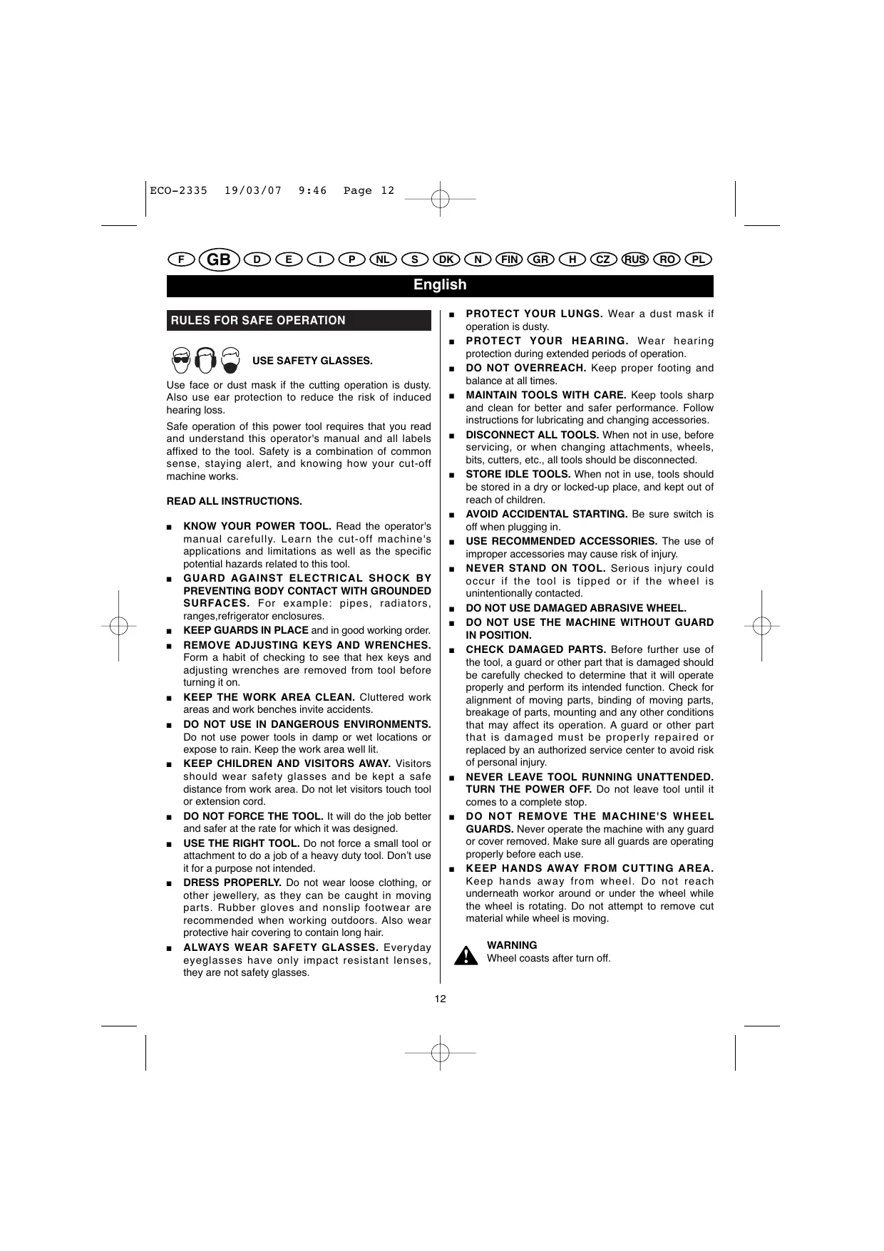 GUARDS. Never operate the machine with any guard or cover removed. Make sure all guards are operating properly before each use. KEEP HANDS AWAY FROM CUTTING AREA. Keep hands away from wheel. Do not reach underneath workor around or under the wheel while the wheel is rotating. Do not attempt to remove cut material while wheel is moving. WARNING Wheel coasts after turn off.