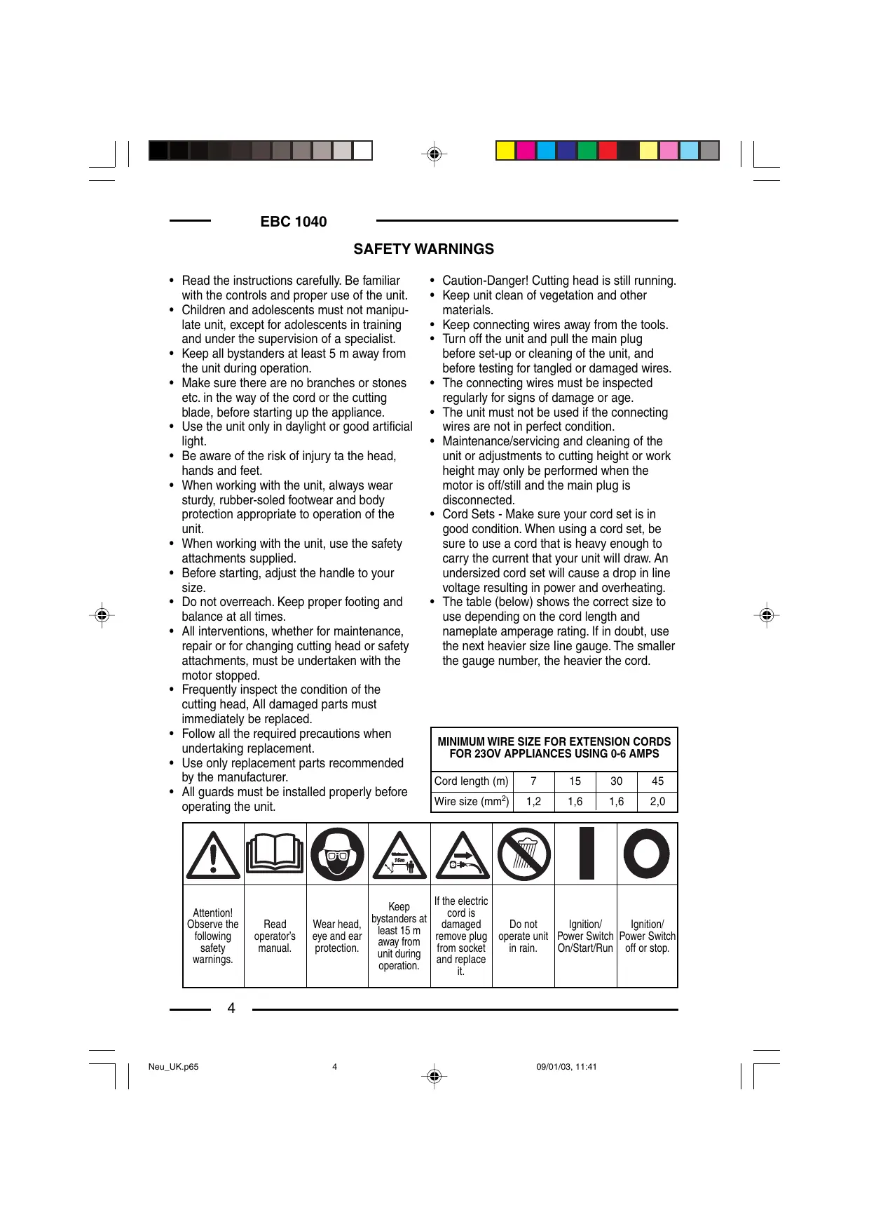 EBC 1040 SAFETY WARNINGS • Read the instructions carefully. Be familiar with the controls and proper use of the unit. • Children and adolescents must not manipulate unit, except for adolescents in training and under the supervision of a specialist. • Keep all bystanders at least 5 m away from the unit during operation. • Make sure there are no branches or stones etc. in the way of the cord or the cutting blade, before starting up the appliance. • Use the unit only in daylight or good artificial light. • Be aware of the risk of injury ta the head, hands and feet. • When working with the unit, always wear sturdy, rubber-soled footwear and body protection appropriate to operation of the unit. • When working with the unit, use the safety attachments supplied. • Before starting, adjust the handle to your size. • Do not overreach. Keep proper footing and balance at all times. • All interventions, whether for maintenance, repair or for changing cutting head or safety attachments, must be undertaken with the motor stopped. • Frequently inspect the condition of the cutting head, All damaged parts must immediately be replaced. • Follow all the required precautions when undertaking replacement. • Use only replacement parts recommended by the manufacturer. • All guards must be installed properly before operating the unit.