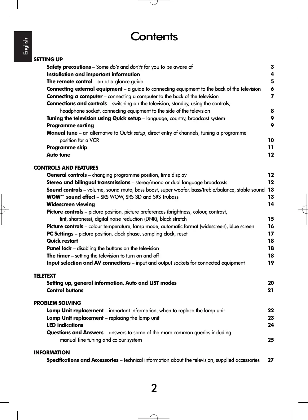CONTROLS AND FEATURES General controls – changing programme position, time display Stereo and bilingual transmissions – stereo/mono or dual language broadcasts Sound controls – volume, sound mute, bass boost, super woofer, bass/treble/balance, stable sound WOW™ sound effect – SRS WOW, SRS 3D and SRS Trubass Widescreen viewing Picture controls – picture position, picture preferences (brightness, colour, contrast, tint, sharpness), digital noise reduction (DNR), black stretch Picture controls – colour temperature, lamp mode, automatic format (widescreen), blue screen PC Settings – picture position, clock phase, sampling clock, reset Quick restart Panel lock – disabling the buttons on the television The timer – setting the television to turn on and off Input selection and AV connections – input and output sockets for connected equipment