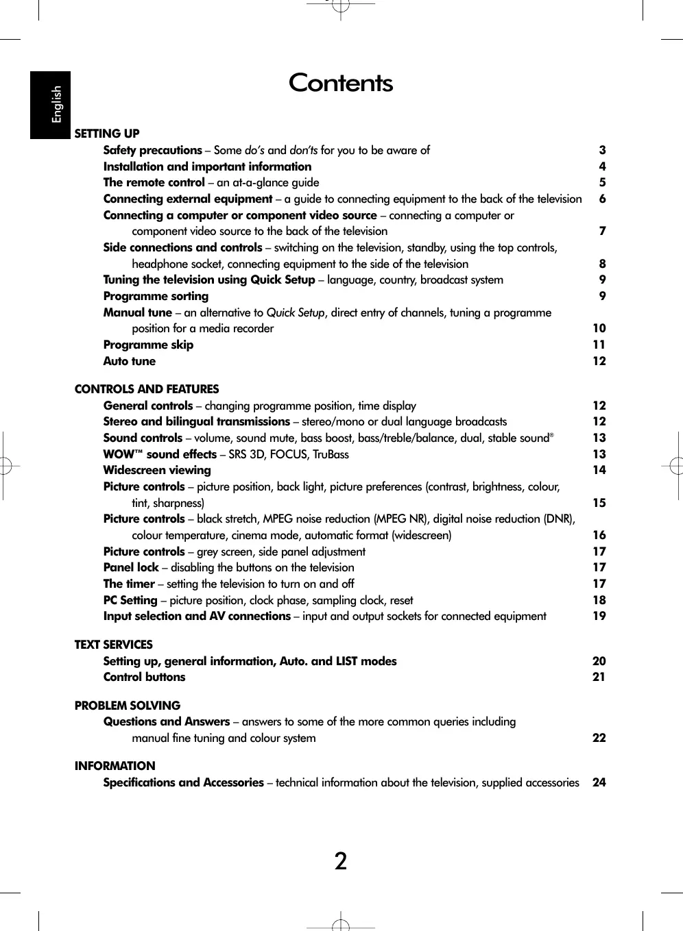 27/32/37WL56 Series Owner's manual Contents SETTING UP Safety precautions – Some do’s and don’ts for you to be aware of Installation and important information The remote control – an at-a-glance guide Connecting external equipment – a guide to connecting equipment to the back of the television 6 Connecting a computer or component video source – connecting a computer or component video source to the back of the television Side connections and controls – switching on the television, standby, using the top controls, headphone socket, connecting equipment to the side of the television Tuning the television using Quick Setup – language, country, broadcast system Programme sorting Manual tune – an alternative to Quick Setup, direct entry of channels, tuning a programme position for a media recorder Programme skip Auto tune