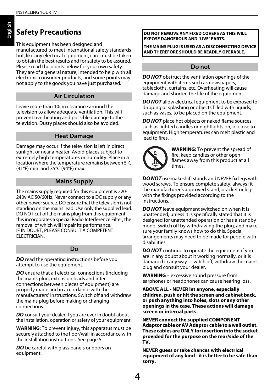Safety Precautions This equipment has been designed and manufactured to meet international safety standards but, like any electrical equipment, care must be taken to obtain the best results and for safety to be assured. Please read the points below for your own safety. They are of a general nature, intended to help with all electronic consumer products, and some points may not apply to the goods you have just purchased. Air Circulation Leave more than 10cm clearance around the television to allow adequate ventilation. This will prevent overheating and possible damage to the television. Dusty places should also be avoided. Heat Damage Damage may occur if the television is left in direct sunlight or near a heater. Avoid places subject to extremely high temperatures or humidity. Place in a location where the temperature remains between 5°C {41°F) min. and 35°C (94°F) max. Mains Supply The mains supply required for this equipment is 220- 240v AC 50/60Hz. Never connect to a DC supply or any other power source. DO ensure that the television is not standing on the mains lead. Use onlythe supplied lead. DO NOT cut off the mains plug from this equipment, this incorporates a special Radio Interference Filter, the removal of which will impair its performance.