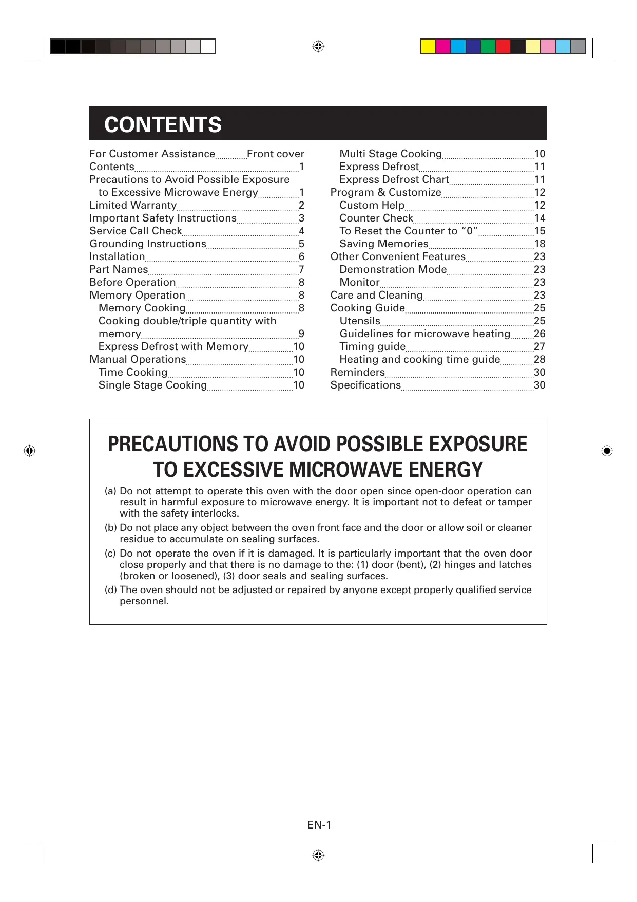 CONTENTS For Customer Assistance Front cover Contents Precautions to Avoid Possible Exposure to Excessive Microwave Energy Limited Warranty Important Safety Instructions Service Call Check Grounding Instructions Installation Part Names Before Operation Memory Operation Memory Cooking Cooking double/triple quantity with memory Express Defrost with Memory Manual Operations Time Cooking Single Stage Cooking