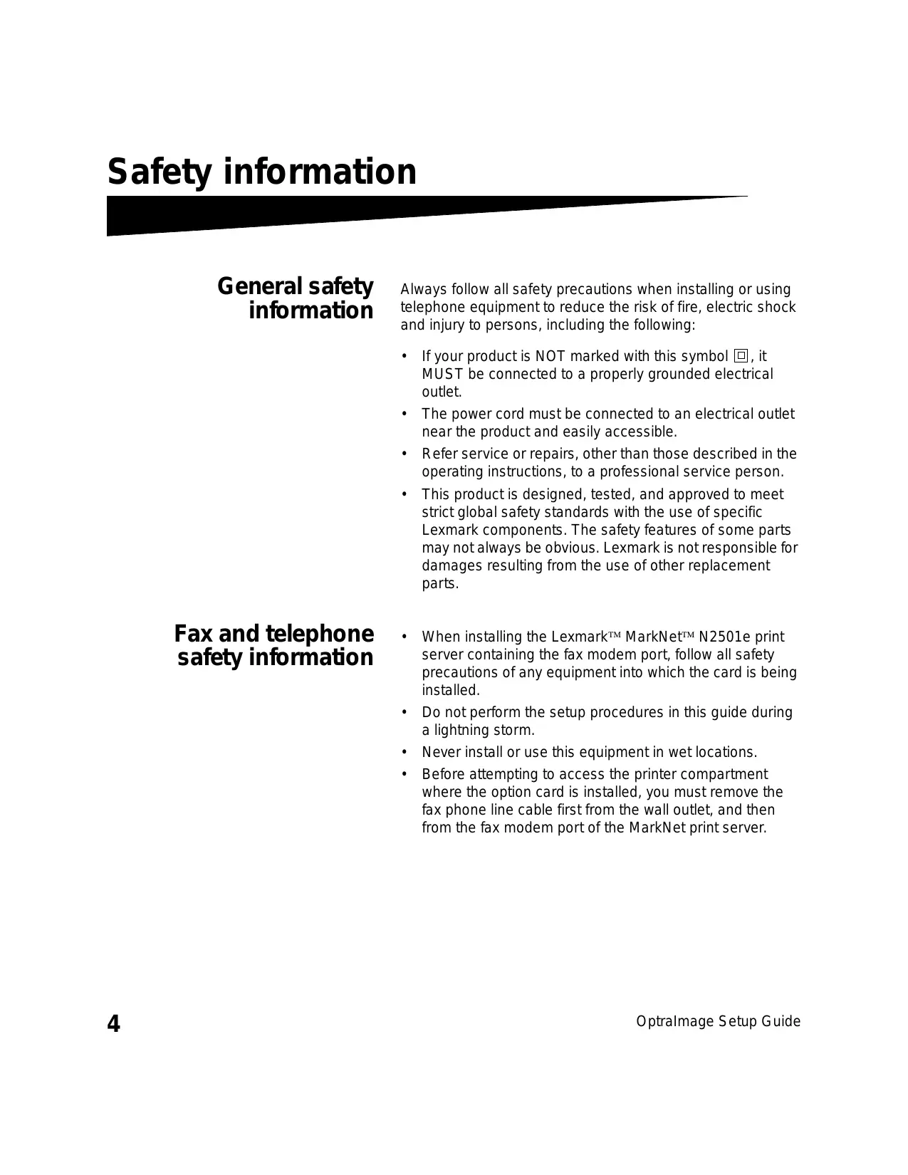 When installing the Lexmark MarkNet N2501e print server containing the fax modem port, follow all safety precautions of any equipment into which the card is being installed.