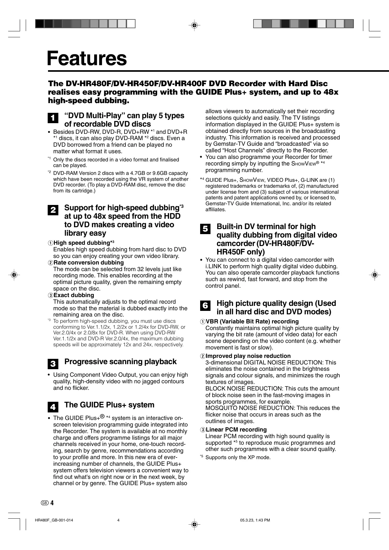 Features The DV-HR480F/DV-HR450F/DV-HR400F DVD Recorder with Hard Disc realises easy programming with the GUIDE Plus+ system, and up to 48x high-speed dubbing. El “DVD Multi-Play” can play 5 types of recordable DVD discs Besides DVD-RW, DVD-R, DVD+RW *! and DVD+R *! discs, it can also play DVD-RAM * discs. Even a DVD borrowed from a friend can be played no matter what format it uses. Only the discs recorded in a video format and finalised can be played. DVD-RAM Version 2 discs with a 4.7GB or 9.6GB capacity which have been recorded using the VR system of another DVD recorder. (To play a DVD-RAM disc, remove the disc from its cartridge.) [2 | Support for high-speed dubbing'* at up to 48x speed from the HDD to DVD makes creating a video library easy @High speed dubbing* Enables high speed dubbing from hard disc to DVD So you can enjoy creating your own video library. Rate conversion dubbing The mode can be selected from 32 levels just like recording mode. This enables recording at the optimal picture quality, given the remaining empty space on the disc. @Exact dubbing This automatically adjusts to the optimal record mode so that the material is dubbed exactly into the remaining area on the disc. 8 To perform high-speed dubbing, you must use discs conforming to Ver.1.1/2x, 1.2/2x or 1.2/4x for DVD-RW, or Ver.2.0/4x or 2.0/8x for DVD-R. When using DVD-RW Ver.1.1/2x and DVD-R Ver.2.0/4x, the maximum dubbing speeds will be approximately 12x and 24x, respectively. E Progressive scanning playback + Using Component Video Output, you can enjoy high quality, high-density video with no jagged contours and no flicker. a | The GUIDE Plus+ system + The GUIDE Plus+® * system is an interactive on- screen television programming guide integrated into the Recorder. The system is available at no monthly charge and offers programme listings for all major channels received in your home, one-touch record- ing, search by genre, recommendations according to your profile and more. In this new era of ever- increasing number of channels, the GUIDE Plus+ system offers television viewers a convenient way to find out what's on right now or in the next week, by channel or by genre. The GUIDE Plus+ system also @ 4 T7] | HR480F_GB-001-014 n allows viewers to automatically set their recording selections quickly and easily. The TV listings information displayed in the GUIDE Plus+ system is obtained directly from sources in the broadcasting industry. This information is received and processed by Gemstar-TV Guide and “broadcasted” via so called “Host Channels” directly to the Recorder. You can also programme your Recorder for timer recording simply by inputting the SHowViEw® ** programming number. “4 GUIDE Plus+, SHowViEw, VIDEO Plus+, G-LINK are (1) registered trademarks or trademarks of, (2) manufactured under license from and (3) subject of various international patents and patent applications owned by, or licensed to, Gemstar-TV Guide International, Inc. and/or its related afiliates. Built-in DV terminal for high quality dubbing from digital video camcorder (DV-HR480F/DV- HR450F only) + You can connect to a digital video camcorder with i.LINK to perform high quality digital video dubbing. You can also operate camcorder playback functions such as rewind, fast forward, and stop from the control panel. E High picture quality design (Used in all hard disc and DVD modes) ŒVBR (Variable Bit Rate) recording Constantly maintains optimal high picture quality by varying the bit rate (amount of video data) for each scene depending on the video content (e.g. whether movement is fast or slow). @improved play noise reduction 3-dimensional DIGITAL NOISE REDUCTION: This eliminates the noise contained in the brightness signals and colour signals, and minimizes the rough textures of images. BLOCK NOISE REDUCTION: This cuts the amount of block noise seen in the fast-moving images in sports programmes, for example. MOSQUITO NOISE REDUCTION: This reduces the flicker noise that occurs in areas such as the outlines of images. @Linear PCM recording Linear PCM recording with high sound quality is supported * to reproduce music programmes and other such programmes with a clear sound quality. ‘$ Supports only the XP mode. 053.28, 1:48 PM