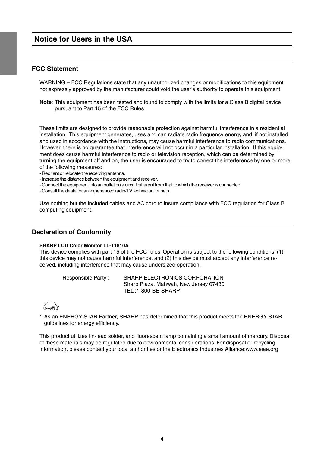 * As an ENERGY STAR Partner, SHARP has determined that this product meets the ENERGY STAR guidelines for energy efficiency. This product utilizes tin-lead solder, and fluorescent lamp containing a small amount of mercury. Disposal of these materials may be regulated due to environmental considerations. For disposal or recycling information, please contact your local authorities or the Electronics Industries Alliance:www.eiae.org