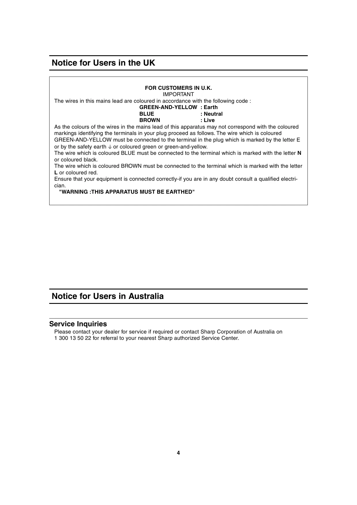 Notice for Users in the UK FOR CUSTOMERS IN U.K. IMPORTANT The wires in this mains lead are coloured in accordance with the following code : GREEN-AND-YELLOW : Earth BLUE : Neutral BROWN : Live As the colours of the wires in the mains lead of this apparatus may not correspond with the coloured markings identifying the terminals in your plug proceed as follows. The wire which is coloured GREEN-AND-YELLOW must be connected to the terminal in the plug which is marked by the letter E or by the safety earth L or coloured green or green-and-yellow. The wire which is coloured BLUE must be connected to the terminal which is marked with the letter N or coloured black. The wire which is coloured BROWN must be connected to the terminal which is marked with the letter L or coloured red. Ensure that your equipment is connected correctly-if you are in any doubt consult a qualified electri- cian. “WARNING :THIS APPARATUS MUST BE EARTHED"