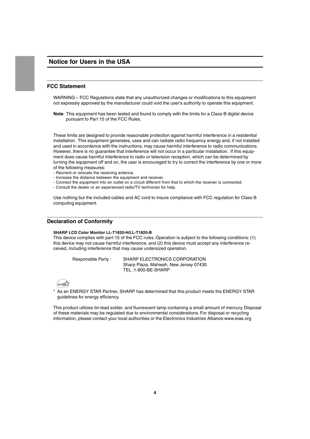 SHARP LCD Color Monitor LL-T1820-H/LL-T1820-B This device complies with part 15 of the FCC rules. Operation is subject to the following conditions: (1) this device may not cause harmful interference, and (2) this device must accept any interference received, including interference that may cause undersized operation.