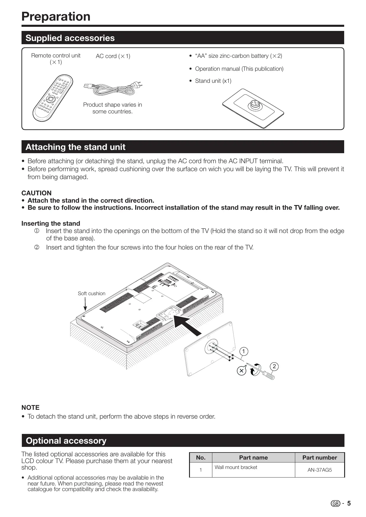 - To detach the stand unit, perform the above steps in reverse order. Optional accessory The listed optional accessories are available for this LOD colour TV. Please purchase them at your nearest Re RerMeme) Rarnumeen shop. 1 Wall mount bracket AN-37AG5 + Additional optional accessories may be available in the near future. When purchasing, please read the newest catalogue for compatibility and check the availability.