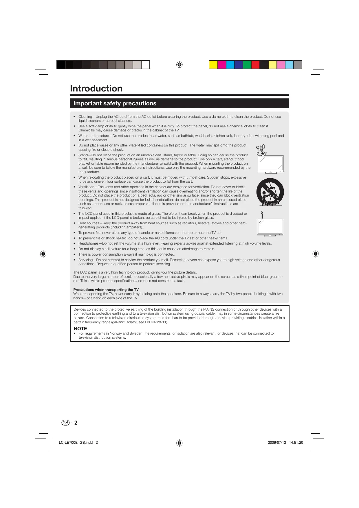 ‘The LCD panel is a very high technology product, gving you fine picture details. Due to the very large number of pixels, occasionaly a few non-active pixels may appear on the screen as a fixed point of blue, green or red. This is within product speciications and does not constitute a fau. Precautions when transporting the TV. Wen transporing the TV, never carry it by holding onto the speakers. Be sure to always cany the TV by two people holding it with two hands—one hand on each side of the TV. Devices connected to the protective sarthing of the building installation through the MAINS connection or through other devices with a connection to protective earthing and to a television distribution system using coaxial cable, may in some cicumstances create a fre hazard. Connection to a television distribution system therefore has to be provided through a device providing electrical isolation wéthin a certain frequency range (gaManic isolator, see EN 60728-1 1) NOTE + For requirements in Norway and Sweden, the requirements for isolation are also relevant for devices that can be connected to television distribution systems. @ -2 | LC-LE7OOE GBindd 2 & 2009/0713 14:51:20 |
