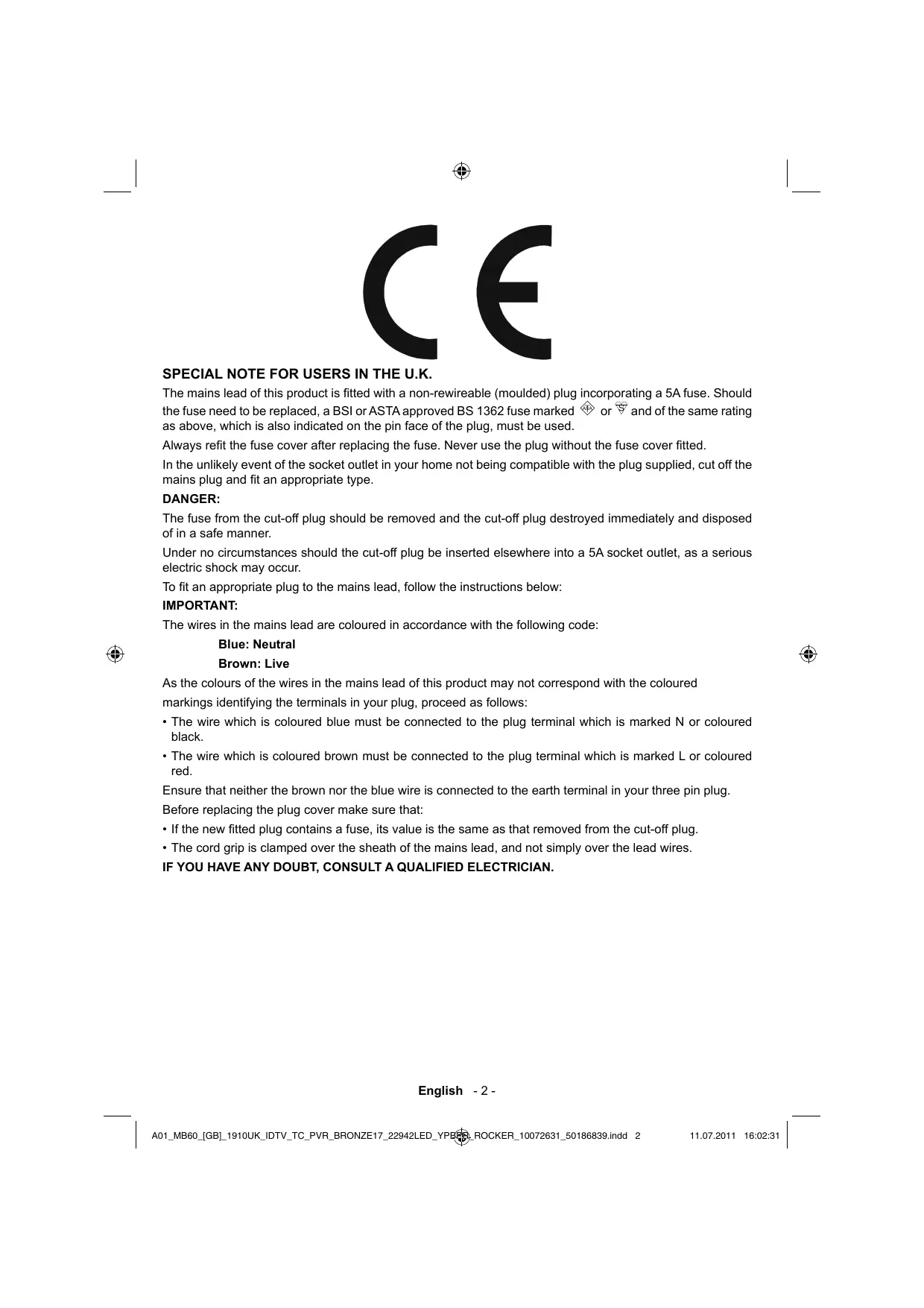 - The cord grip is clamped over the sheath of the mains lead, and not simply over the lead wires. IF YOU HAVE ANY DOUBT, CONSULT A QUALIFIED ELECTRICIAN. English - 2 - A01_MB60_[GB]_1910UK_IDTV_TC_PVR_BRONZE17_22942LED_YPBPR_ROCKER_10072631_50186839.indd 2