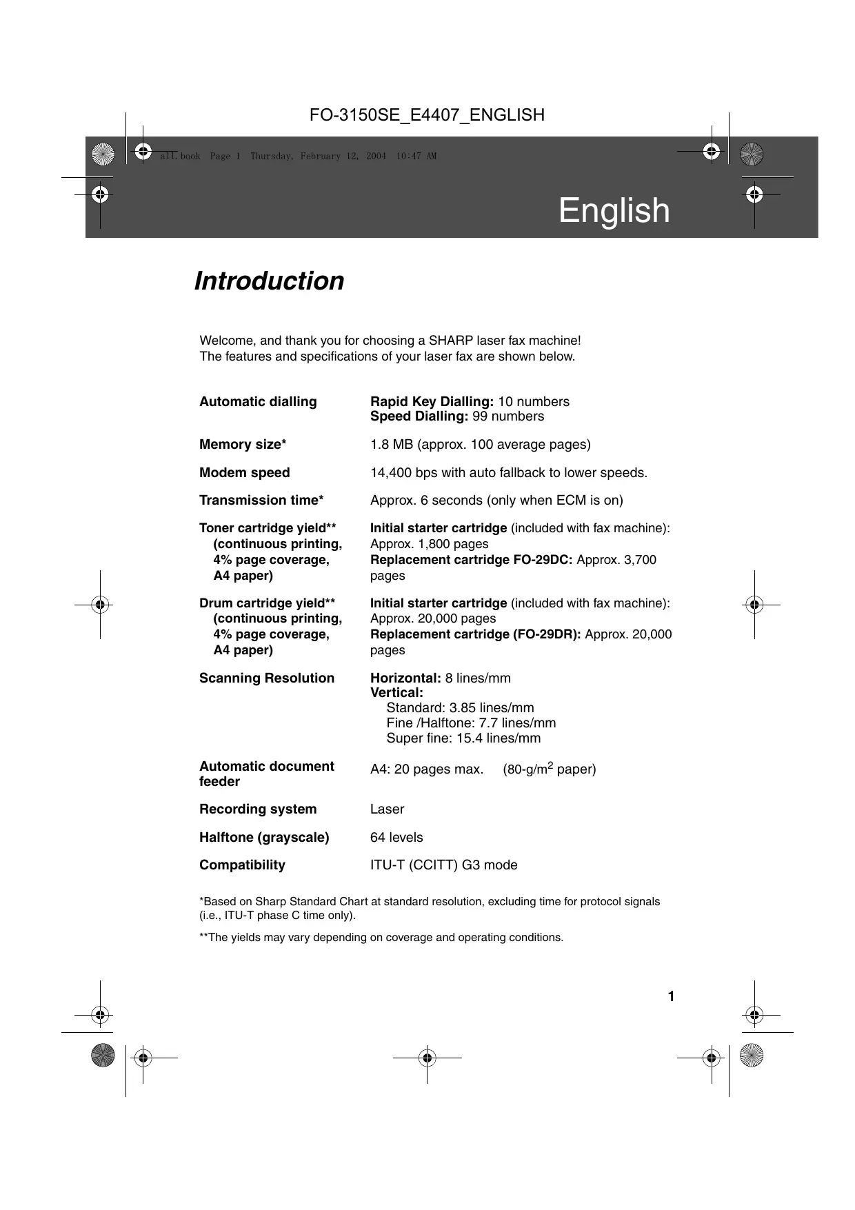 Introduction Welcome, and thank you for choosing a SHARP laser fax machine! The features and specifications of your laser fax are shown below. Automatic dialling Memory size* Modem speed Transmission time* Toner cartridge yield** (continuous printing, 4% page coverage, A4 paper) Drum cartridge yield** (continuous printing, 4% page coverage, A4 paper) Scanning Resolution Automatic document feeder Recording system Halftone (grayscale) Compatibility Rapid Key Dialling: 10 numbers Speed Dialling: 99 numbers