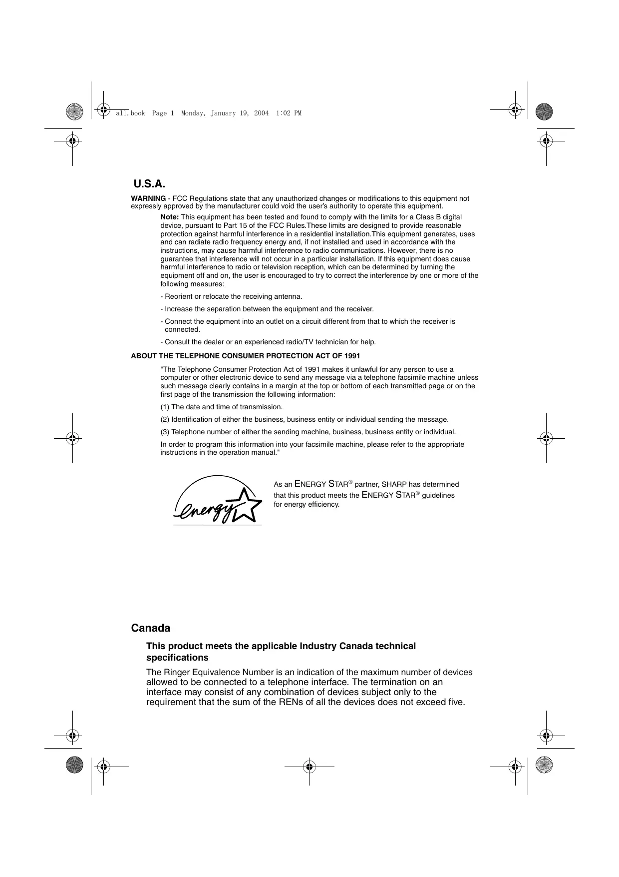 book Page 1 Monday, January 19, 2004 1:02 PM U.S.A. WARNING - FCC Regulations state that any unauthorized changes or modifications to this equipment not expressly approved by the manufacturer could void the user's authority to operate this equipment. Note: This equipment has been tested and found to comply with the limits for a Class B digital device, pursuant to Part 15 of the FCC Rules.These limits are designed to provide reasonable protection against harmful interference in a residential installation. This equipment generates, uses and can radiate radio frequency energy and, if not installed and used in accordance with the instructions, may cause harmful interference to radio communications. However, there is no guarantee that interference will not occur in a particular installation. If this equipment does cause harmful interference to radio or television reception, which can be determined by turning the equipment off and on, the user is encouraged to try to correct the interference by one or more of the following measures: - Reorient or relocate the receiving antenna. - Increase the separation between the equipment and the receiver. - Connect the equipment into an outlet on a circuit different from that to which the receiver is connected. - Consult the dealer or an experienced radio/TV technician for help. ABOUT THE TELEPHONE CONSUMER PROTECTION ACT OF 1991 “The Telephone Consumer Protection Act of 1991 makes it unlawful for any person to use a computer or other electronic device to send any message via a telephone facsimile machine unless such message clearly contains in a margin at the top or bottom of each transmitted page or on the first page of the transmission the following information: {1) The date and time of transmission. {2) Identification of either the business, business entity or individual sending the message. (8) Telephone number of either the sending machine, business, business entity or individual. In order to program this information into your facsimile machine, please refer to the appropriate instructions in the operation manual." As an ENERGY STAR® partner, SHARP has determined that this product meets the ENERGY STAR® guidelines lonerff, for energy eficiency. Canada This product meets the applicable Industry Canada tech specifications The Ringer Equivalence Number is an indication of the maximum number of devices allowed to be connected to a telephone interface. The termination on an interface may consist of any combination of devices subject only to the requirement that the sum of the RENSs of all the devices does not exceed five.