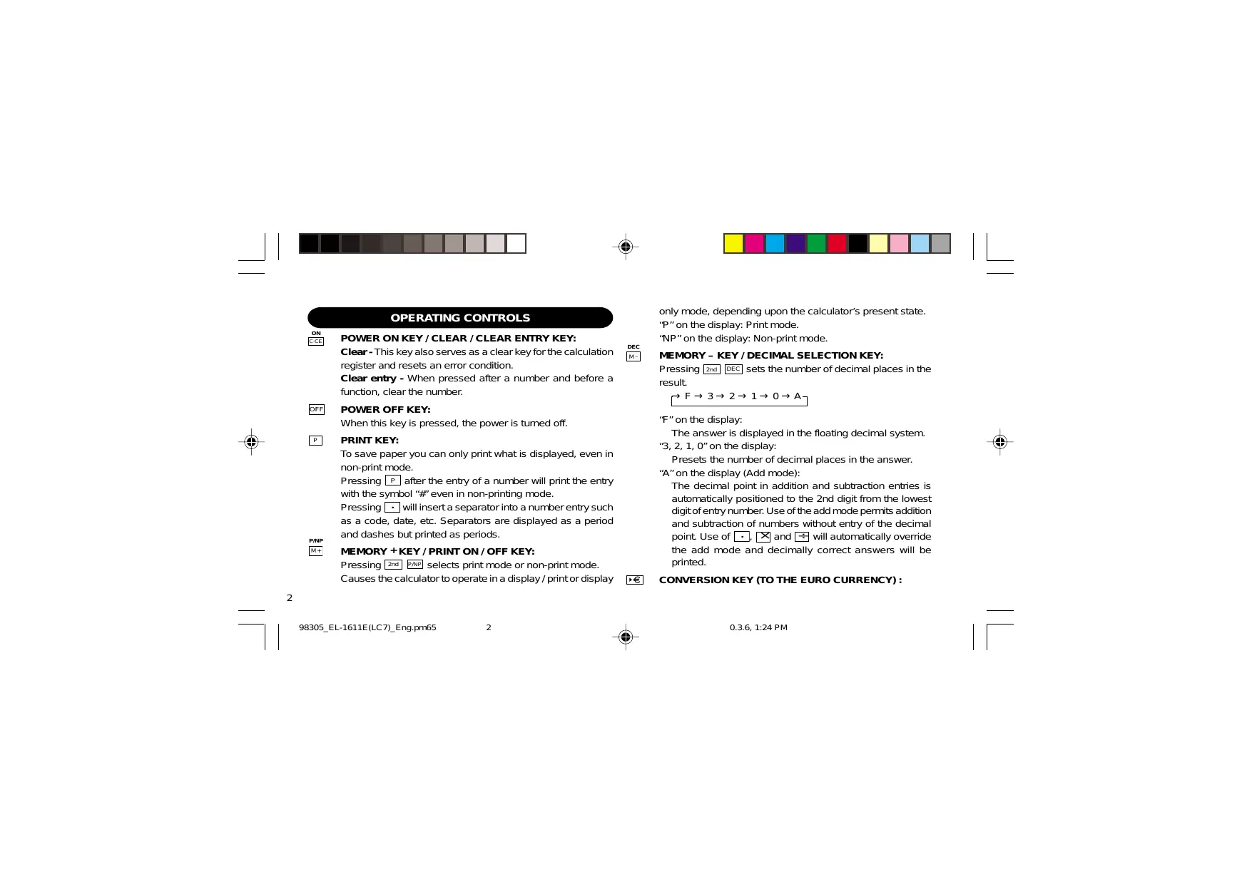Pressing 2nd DEC sets the number of decimal places in the result. →F→3→2→1→0→A “F” on the display: The answer is displayed in the floating decimal system. “3, 2, 1, 0” on the display: Presets the number of decimal places in the answer. “A” on the display (Add mode): The decimal point in addition and subtraction entries is automatically positioned to the 2nd digit from the lowest digit of entry number. Use of the add mode permits addition and subtraction of numbers without entry of the decimal point. Use of • , × and ÷ will automatically override the add mode and decimally correct answers will be printed. CONVERSION KEY (TO THE EURO CURRENCY) :