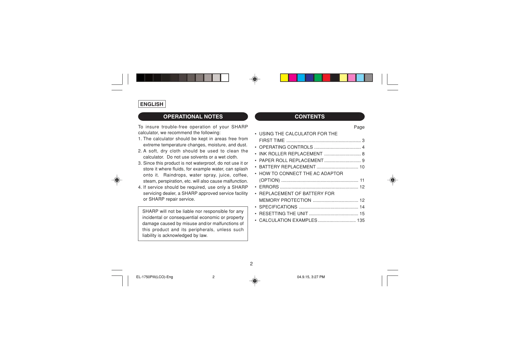 1. The calculator should be kept in areas free from extreme temperature changes, moisture, and dust. 2. A soft, dry cloth should be used to clean the calculator. Do not use solvents or a wet cloth. 3. Since this product is not waterproof, do not use it or store it where fluids, for example water, can splash onto it. Raindrops, water spray, juice, coffee, steam, perspiration, etc. will also cause malfunction. 4. If service should be required, use only a SHARP servicing dealer, a SHARP approved service facility or SHARP repair service.