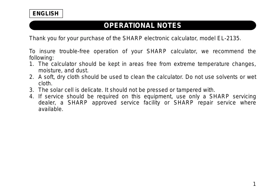 OPERATIONAL NOTES Thank you for your purchase of the SHARP electronic calculator, model EL-2135. To insure trouble-free operation of your SHARP calculator, we recommend the following: 1. The calculator should be kept in areas free from extreme temperature changes, moisture, and dust. 2. A soft, dry cloth should be used to clean the calculator. Do not use solvents or wet cloth. 3. The solar cell is delicate. It should not be pressed or tampered with. 4. If service should be required on this equipment, use only a SHARP servicing dealer, a SHARP approved service facility or SHARP repair service where available.