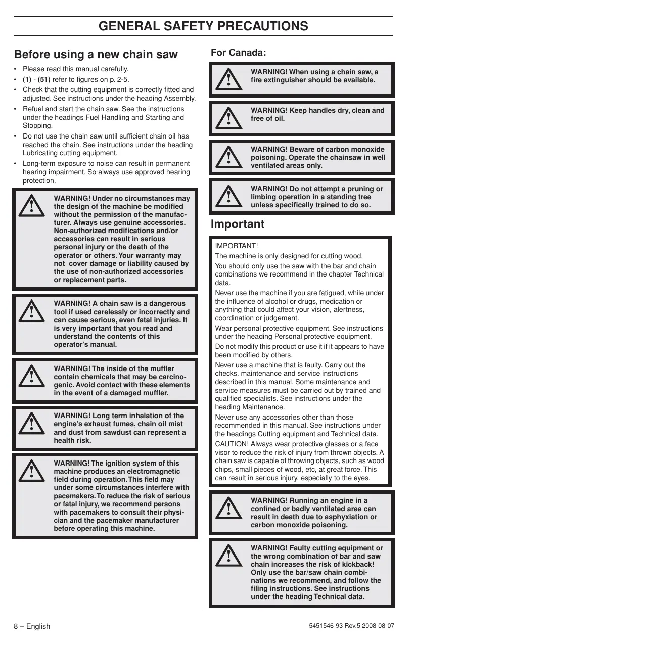 2007 y posteriores tienen una garantia de dos años. Si algün componente de su motor relacionado con las emisiones (como los indicados arriba) es defectuoso, el componente ser reparado o sustituido por Husqvarna. ATENCION! La reculada se puede producir cuando la punta de la espada toca en un objeto o cuando la madera se cierra y agarra la cadena de motosierra en el corte.