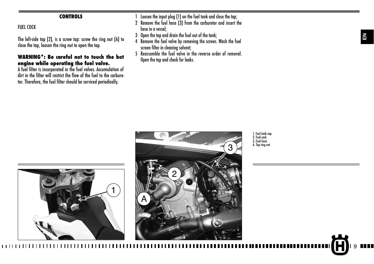 FUEL COCK The left-side tap (2), is a screw tap: screw the ring nut (A) to close the tap, loosen the ring nut to open the tap. WARNING*: Be careful not to touch the hot engine while operating the fuel valve. A fuel filter is incorporated in the fuel valves. Accumulation of dirt in the filter will restrict the flow of the fuel to the carburetor. Therefore, the fuel filter should be serviced periodically. 1 Loosen the input plug (1) on the fuel tank and close the tap; 2 Remove the fuel hose (3) from the carburetor and insert the hose in a vessel; 3 Open the tap and drain the fuel out of the tank; 4 Remove the fuel valve by removing the screws. Wash the fuel screen filter in cleaning solvent; 5 Reassemble the fuel valve in the reverse order of removal. Open the tap and check for leaks.