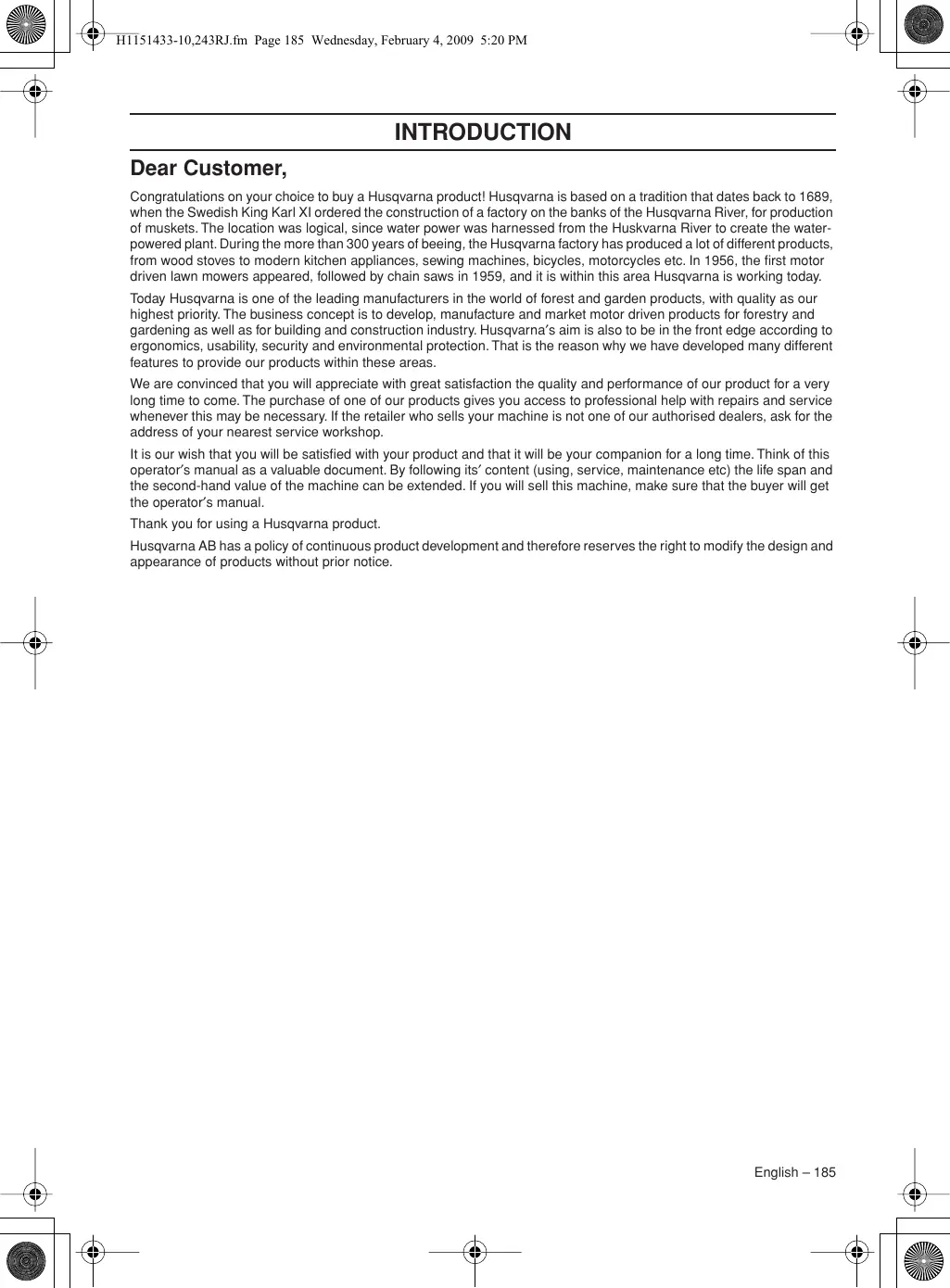 43 Husqvarna est aujourd’hui un des plus grands fabricants du monde de produits destinés à l’entretien des forêts et des jardins. La qualité et les performances sont nos priorités. Notre concept d’affaires est de développer, fabriquer et commercialiser des produits à moteur pour l’entretien des forêts et des jardins et pour les entreprises de construction et d’aménagement des sols. L’objectif d’Husqvarna est aussi d’être à la pointe du progrès en matière d’ergonomie, de facilité d’utilisation, de sécurité et de protection de l’environnement; un grand nombre d’innovations ont été développées pour améliorer les produits dans ces domaines. Nous sommes persuadés que vous apprécierez la qualité et les performances de nos produits pendant de longues années. L’achat d’un de nos produits vous garantit une assistance professionnelle au niveau du service et des réparations en cas de besoin. Si la machine n’a pas été achetée chez un de nos revendeurs autorisés, demandez à un revendeur l’adresse de l’atelier d’entretien le plus proche. Nous espérons que cette machine vous donnera toute satisfaction et qu’elle vous accompagnera pendant de longues années. N’oubliez pas que ce manuel d’utilisation est important. En suivant les instructions qu’il contient (utilisation, révision, entretien, etc.), il est possible d’allonger considérablement la durée de vie de la machine et d’augmenter sa valeur sur le marché de l’occasion. En cas de vente de la machine, ne pas oublier de remettre le manuel d’utilisation au nouveau propriétaire. Nous vous remercions d'utiliser un produit Husqvarna ! Husqvarna AB travaille continuellement au développement de ses produits et se réserve le droit d’en modifier, entre autres, la conception et l’aspect sans préavis.
