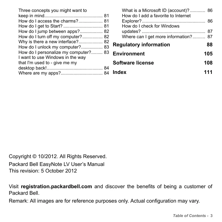 Packard Bell EasyNote LV User’s Manual This revision: 5 October 2012 Visit registration.packardbell.com and discover the benefits of being a customer of Packard Bell. Remark: All images are for reference purposes only. Actual configuration may vary. Table of Contents - 3
