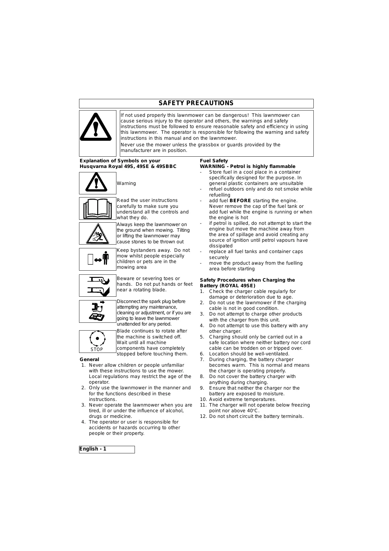 accidents or hazards occurring to other people or their property. English - 1 Fuel Safety WARNING - Petrol is highly flammable Store fuel in a cool place in a container specifically designed for the purpose. In general plastic containers are unsuitable refuel outdoors only and do not smoke while refuelling add fuel BEFORE starting the engine. Never remove the cap of the fuel tank or add fuel while the engine is running or when the engine is hot if petrol is spilled, do not attempt to start the engine but move the machine away from the area of spillage and avoid creating any source of ignition until petrol vapours have dissipated replace all fuel tanks and container caps securely move the product away from the fuelling area before starting Safety Procedures when Charging the Battery (ROYAL 49SE)