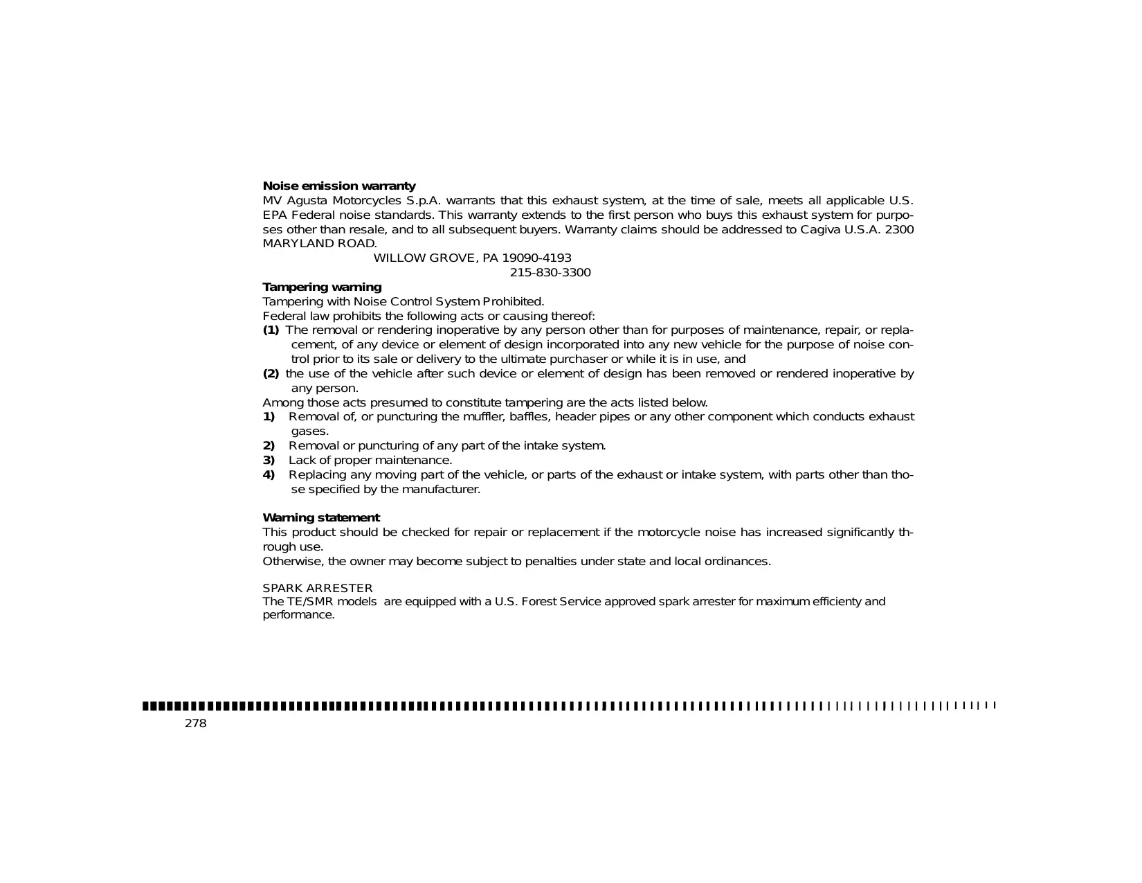 Noise emission warranty MV Agusta Motorcycles S.p.A. warrants that this exhaust system, at the time of sale, meets all applicable U.S. EPA Federal noise standards. This warranty extends to the first person who buys this exhaust system for purposes other than resale, and to all subsequent buyers. Warranty claims should be addressed to Cagiva U.S.A. 2300 MARYLAND ROAD.