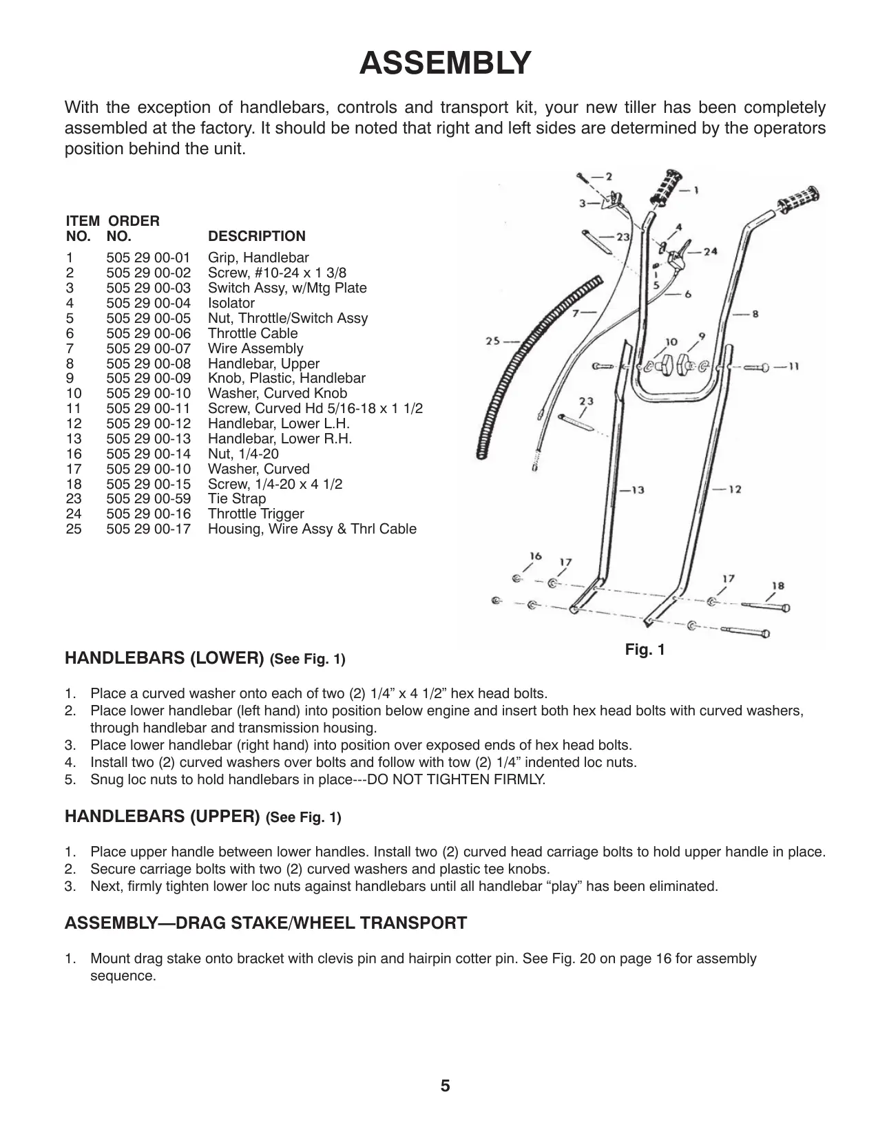 ASSEMBLY With the exception of handlebars, controls and transport kit, your new tiller has been completely assembled at the factory. lt should be noted that right and left sides are determined by the operators position behind the unit. ITEM ORDER
