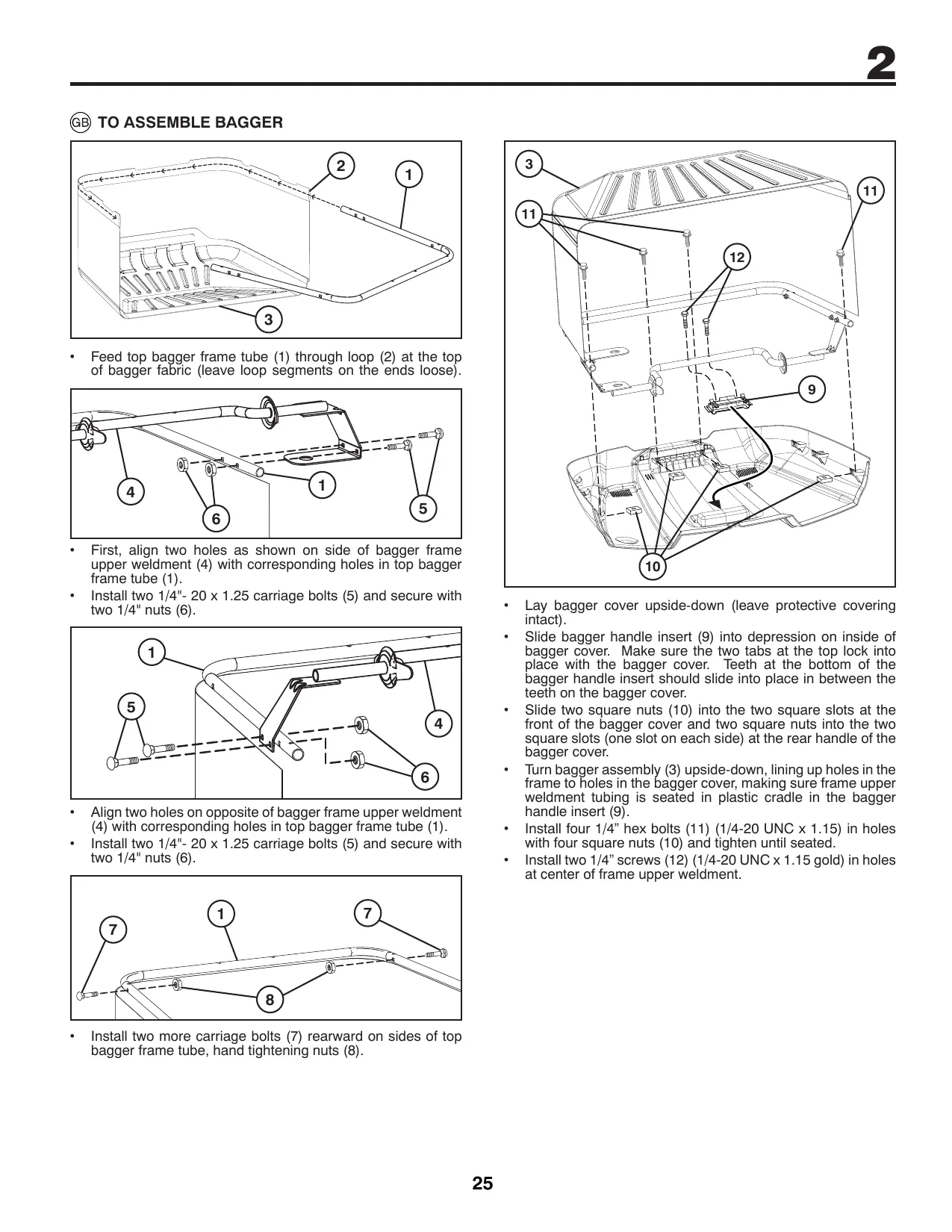 Feed top ba of bagger fal gger frame tube (1) through loop (2) at the top ric (leave loop segments on the ends loose). + First, align two holes as shown on side of bagger frame upper weldment (4) with corresponding holes in top bagger frame tube (1). + Install two 1/4"- 20 x 1.25 carriage bolts (5) and secure with two 1/4" nuts (6). Align two holes on opposite of bagger frame upper weldment (4) with corresponding holes in top bagger frame tube (1). Install two 1/4"- 20 x 1.25 carriage bolts (5) and secure with two 1/4" nuts (6). +__ Install two more carriage bolts (7) rearward on sides of top bagger frame tube, hand tightening nuts (8).