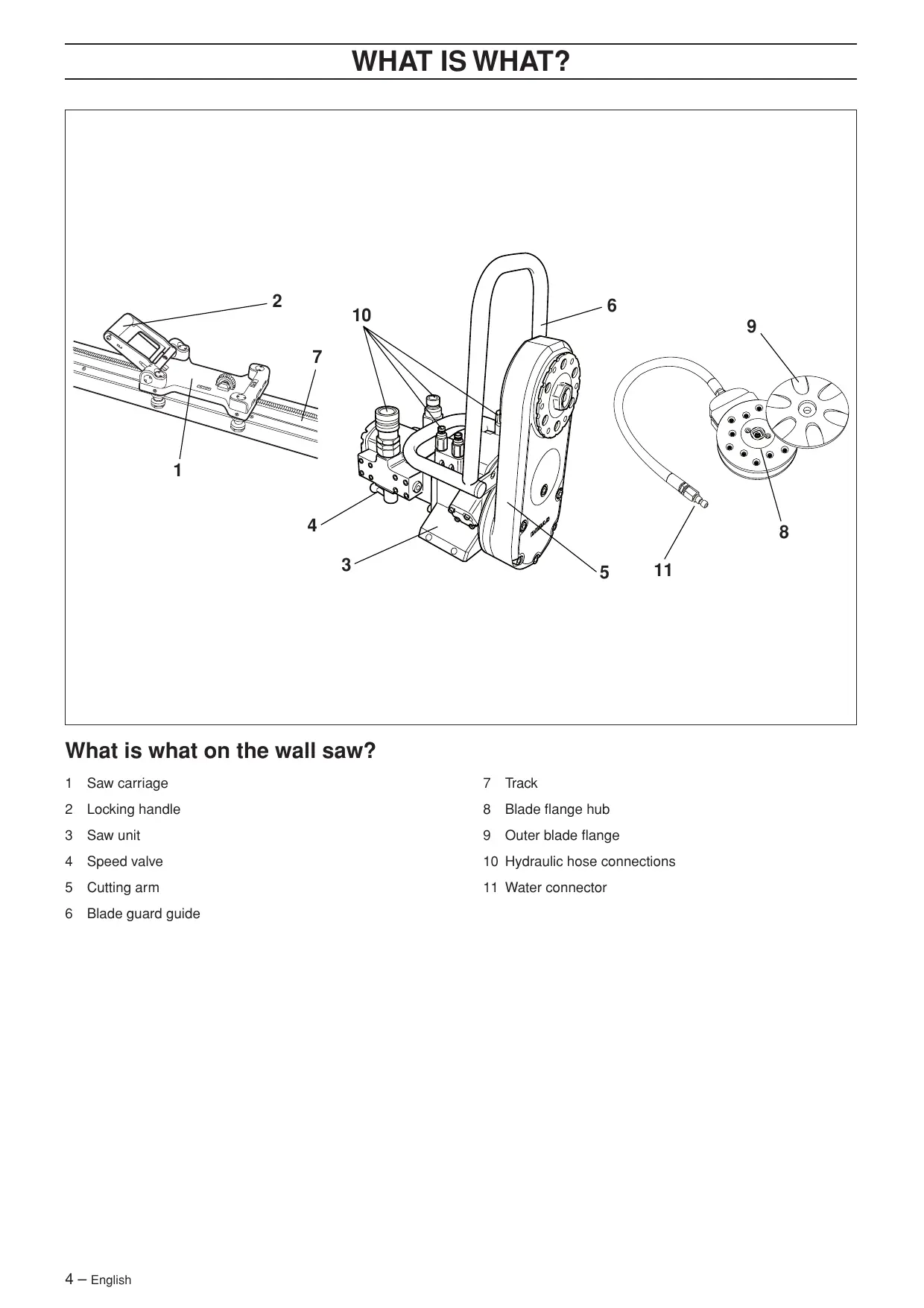 PRESENTATION WS 462 To utilises the input effect in the best possible way the saw is mounted on Husqvarna’ the latest rail. This is a very stable rail, which allows the saw to be controlled more precisely, which in turn results in more efficient cutting. As the equipment’s component parts work with small losses and as the blade is moved in 50 mm closer to the rail compared to earlier models, which has also resulted in a saw with an extremely compact design and at the same time as efficiency has increased. Complete saw equipment consists of: It is our wish that you will be satisfied with your product and that it will be your companion for a long time. Think of this operator′s manual as a valuable document. By following its′ content (using, service, maintenance etc) the life span and the second-hand value of the machine can be extended. If you will sell this machine, make sure that the buyer will get the operator′s manual. A purchase of one of our products gives you access to professional help with repairs and services. If the retailer who sells your machine is not one of our authorised dealers, ask him for the address of your nearest service workshop. Husqvarna Construction Products has a policy of continuous product development. Husqvarna reserves the right to modify the design and appearance of products without prior notice and without further obligation introduce design modifications. General WS 400 is a series of completely new complete wall saws from Husqvarna. The intention when developing the Husqvarna WS 400 series has been to produce a very light yet powerful wall saw that is easy for one person to handle using modern production methods and high performance materials. Among the new features on the WS 400 series is the possibility to secure the blade radially on the saw. As the saw unit is mounted on a carriage using a quick-action mounting instead of directly on the rail, assembly of the saw is significantly easier. 8 – English