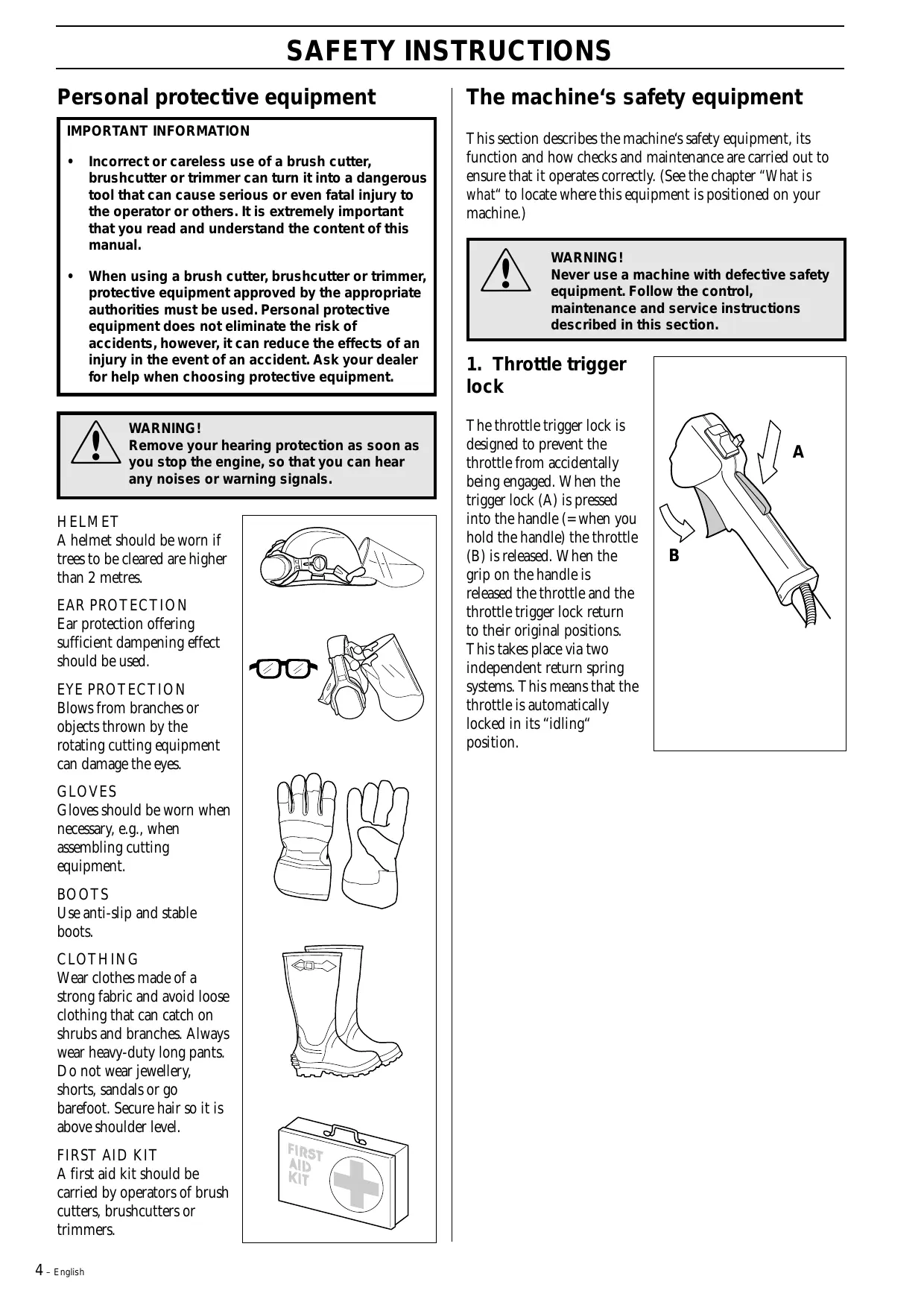 A first aid kit should be carried by operators of brush cutters, brushcutters or trimmers. 4 – English The machine‘s safety equipment This section describes the machine‘s safety equipment, its function and how checks and maintenance are carried out to ensure that it operates correctly. (See the chapter “What is what“ to locate where this equipment is positioned on your machine.)