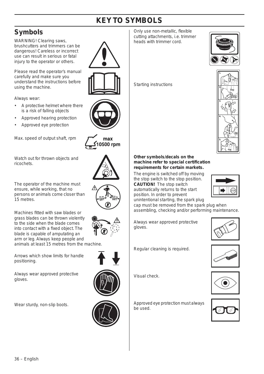 Ne jamais se pencher au-dessus de la protection de l'équipement de coupe. Des cailloux, débris, etc. peuvent être projetés dans les yeux et causer des blessures très graves, voire la cécité. Maintenir à distance toutes les personnes non concernées par le travail. Les enfants, les animaux, les spectateurs et les collègues de travail devront se trouver en dehors de la zone de sécurité, soit à au moins 15 mètres. Arrêter immédiatement la machine si une personne s’approche. Ne tournez jamais sur vous-même avec la machine sans vous assurer d’abord que personne ne se trouve dans la zone de sécurité.