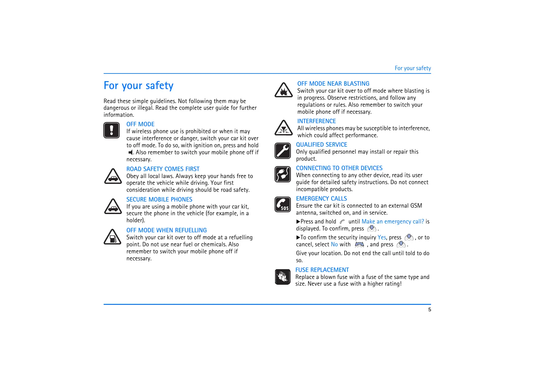 For your safety For your safety Read these simple guidelines. Not following them may be dangerous or illegal. Read the complete user guide for further information. > DE OFF MODE If wireless phone use is prohibited or when it may cause interference or danger, switch your car kit over to off mode. To do so, with ignition on, press and hold ». Also remember to switch your mobile phone off if necessary.
