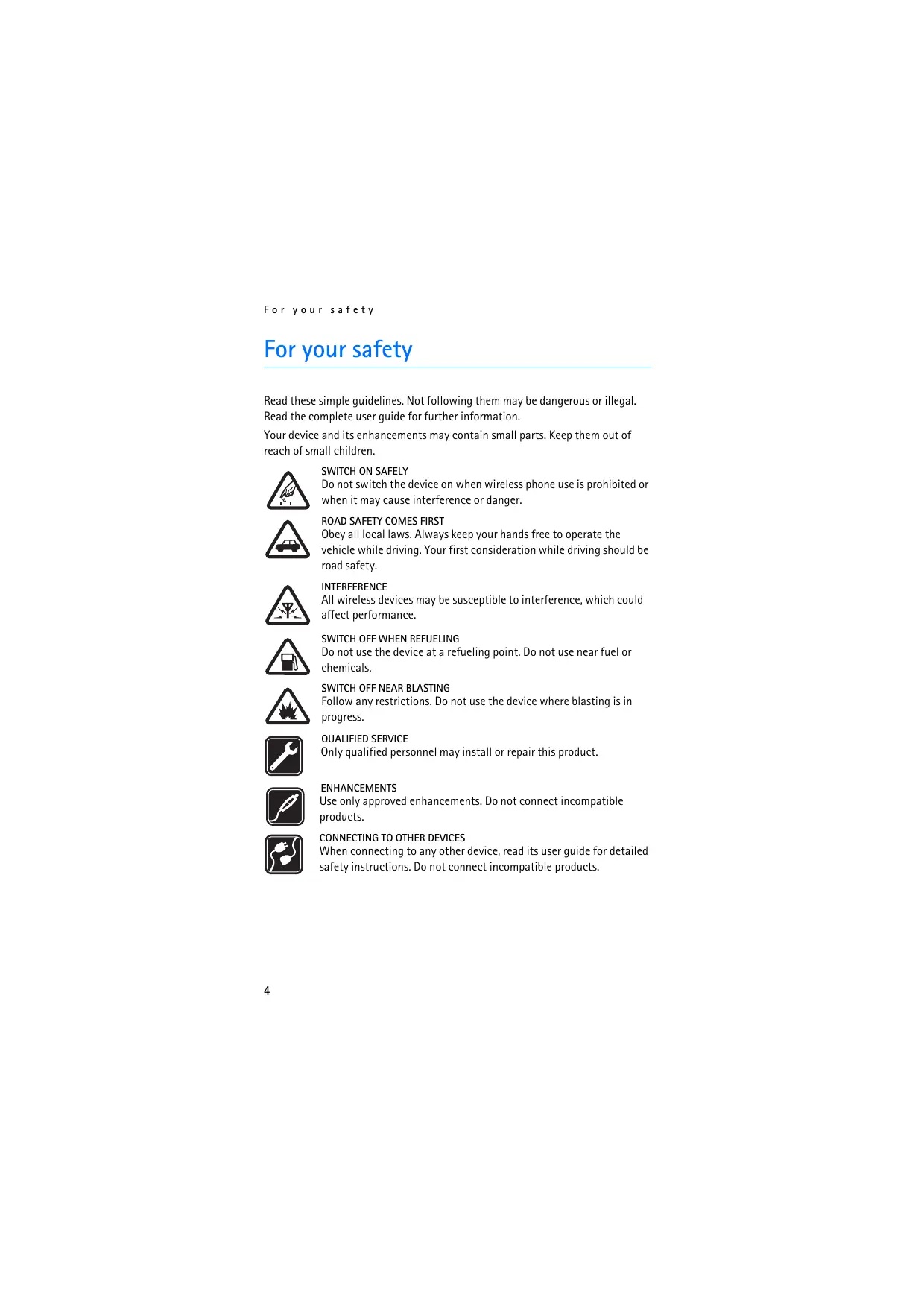 For your safety For your safety Read these simple guidelines. Not following them may be dangerous or illegal. Read the complete user guide for further information. Your device and its enhancements may contain small parts. Keep them out of reach of small children. SEE EE