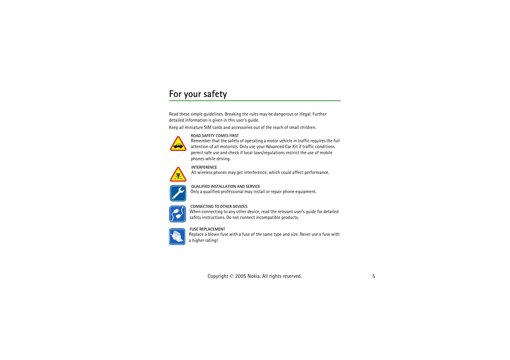 ‘When connecting to any other device, read the relevant user's guide for detailed safety instructions. Do not connect incompatible products. FUSE REPLACEMENT Replace a blown fuse with a fuse of the same type and size. Never use a fuse with a higher rating! Copyright © 2005 Nokia. All rights reserved.