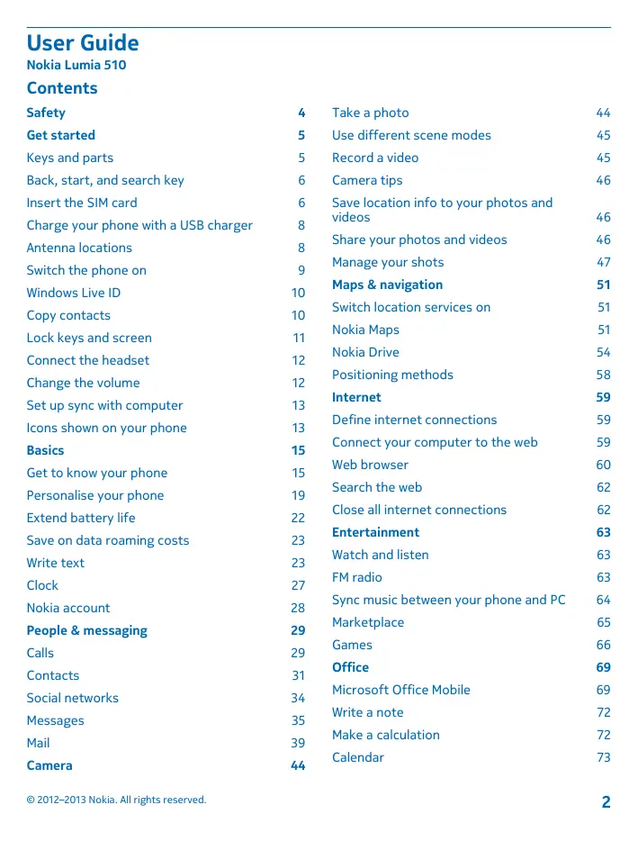 User Guide Nokia Lui 510 Contents Safety Get started Keys and parts Back, start, and search key Insert the SIM card Charge your phone with a USB charger Antenna locations Switch the phone on Windows Live ID Copy contacts Lock keys and screen Connect the headset Change the volume Set up sync with computer Icons shown on your phone Basics Get to know your phone Personalise your phone Extend battery life Save on data roaming costs Write text Clock Nokia account People & messaging Calls Contacts Social networks Messages Mail Camera © 2012-2013 Nokia. A rights reserved. Take a photo Use different scene modes Record a video Camera tips Save location info to your photos and videos Share your photos and videos Manage your shots Maps & navigation sui Nokia Maps h location services on Nokia Drive Positioning methods Internet Define internet connections Connect your computer to the web Web browser Search the web Close all internet connections Entertainment Watch and listen FM ra Sync music between your phone and PC Marketplace Games office Microsoft Office Mobile Write a note Make a calculation Calendar
