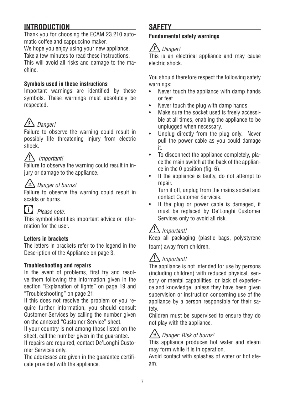 INTRODUCTION SAFETY Thank you for choosing the ECAM 23.210 auto- matic coffee and cappuccino maker. We hope you enjoy using your new appliance. Take a few minutes to read these instructions. This will avoid all risks and damage to the ma- chine. Symbols used in these instructions Important warnings are identified by these symbols. These warnings must absolutely be respected. VAN Danger! Failure to observe the warning could result in possibly life threatening injury from electric shock. A Important! Failure to observe the warning could result in in- jury or damage to the appliance. JAN Danger of burns! Failure to observe the warning could result in Scalds or burns. Q Please note: This symbol identifies important advice or infor- mation for the user. Letters in brackets The letters in brackets refer to the legend in the Description of the Appliance on page 3. Troubleshooting and repairs In the event of problems, first try and resol- ve them following the information given in the section “Explanation of lights” on page 19 and “Troubleshooting” on page 21. If this does not resolve the problem or you re- quire further information, you should consult Customer Services by calling the number given on the annexed “Customer Service” sheet. If your country is not among those listed on the Sheet, call the number given in the guarantee. If repairs are required, contact De’Longhi Custo- mer Services only. The addresses are given in the guarantee certifi- cate provided with the appliance. Fundamental safety warnings VAN Danger! This is an electrical appliance and may cause electric shock. You should therefore respect the following safety warnings: + Never touch the appliance with damp hands or feet. + Never touch the plug with damp hands. + Make sure the socket used is freely accessi- ble at all times, enabling the appliance to be unplugged when necessary. + Unplug directly from the plug only. Never pull the power cable as you could damage it. + To disconnect the appliance completely, pla- ce the main switch at the back of the applian- ce in the O position (fig. 6). + lfthe appliance is faulty, do not attempt to repair. Turn it off, unplug from the mains socket and contact Customer Services. + lfthe plug or power cable is damaged, it must be replaced by De’Longhi Customer Services only to avoid all risk. VAN Important! Keep all packaging (plastic bags, polystyrene foam) away from children. A Important! The appliance is not intended for use by persons {including children) with reduced physical, sen- sory or mental capabilities, or lack of experien- ce and knowledge, unless they have been given supervision or instruction concerning use of the appliance by a person responsible for their sa- fety. Children must be supervised to ensure they do not play with the appliance. VAN Danger: Risk of burns! This appliance produces hot water and steam may form while it is in operation. Avoid contact with splashes of water or hot ste- am.