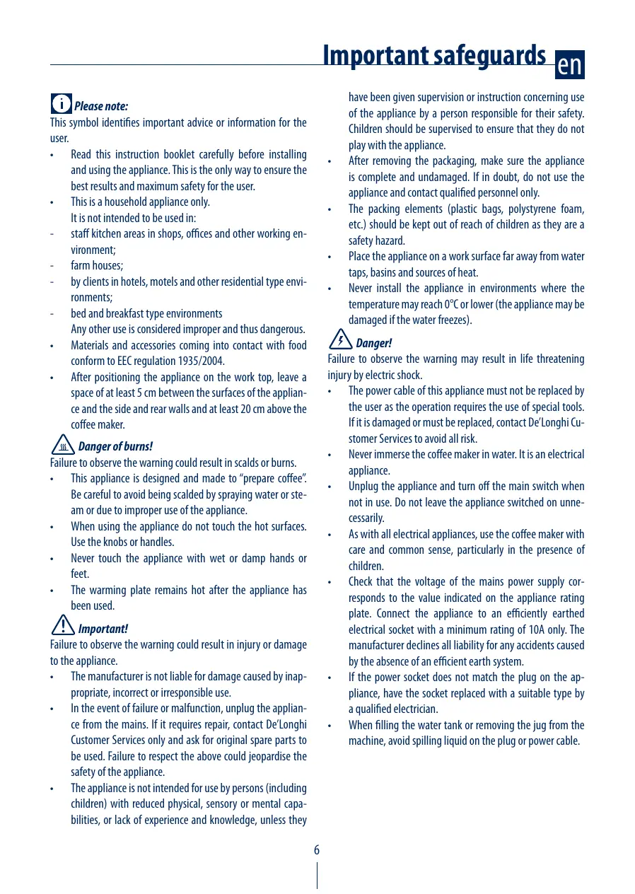 Failure to observe the warning could result in scalds or burns. • This appliance is designed and made to “prepare coffee”. Be careful to avoid being scalded by spraying water or steam or due to improper use of the appliance. • When using the appliance do not touch the hot surfaces. Use the knobs or handles. • Never touch the appliance with wet or damp hands or feet. • The warming plate remains hot after the appliance has been used. Important! Failure to observe the warning could result in injury or damage to the appliance. • The manufacturer is not liable for damage caused by inappropriate, incorrect or irresponsible use. • In the event of failure or malfunction, unplug the appliance from the mains. If it requires repair, contact De’Longhi Customer Services only and ask for original spare parts to be used. Failure to respect the above could jeopardise the safety of the appliance. • The appliance is not intended for use by persons (including children) with reduced physical, sensory or mental capabilities, or lack of experience and knowledge, unless they