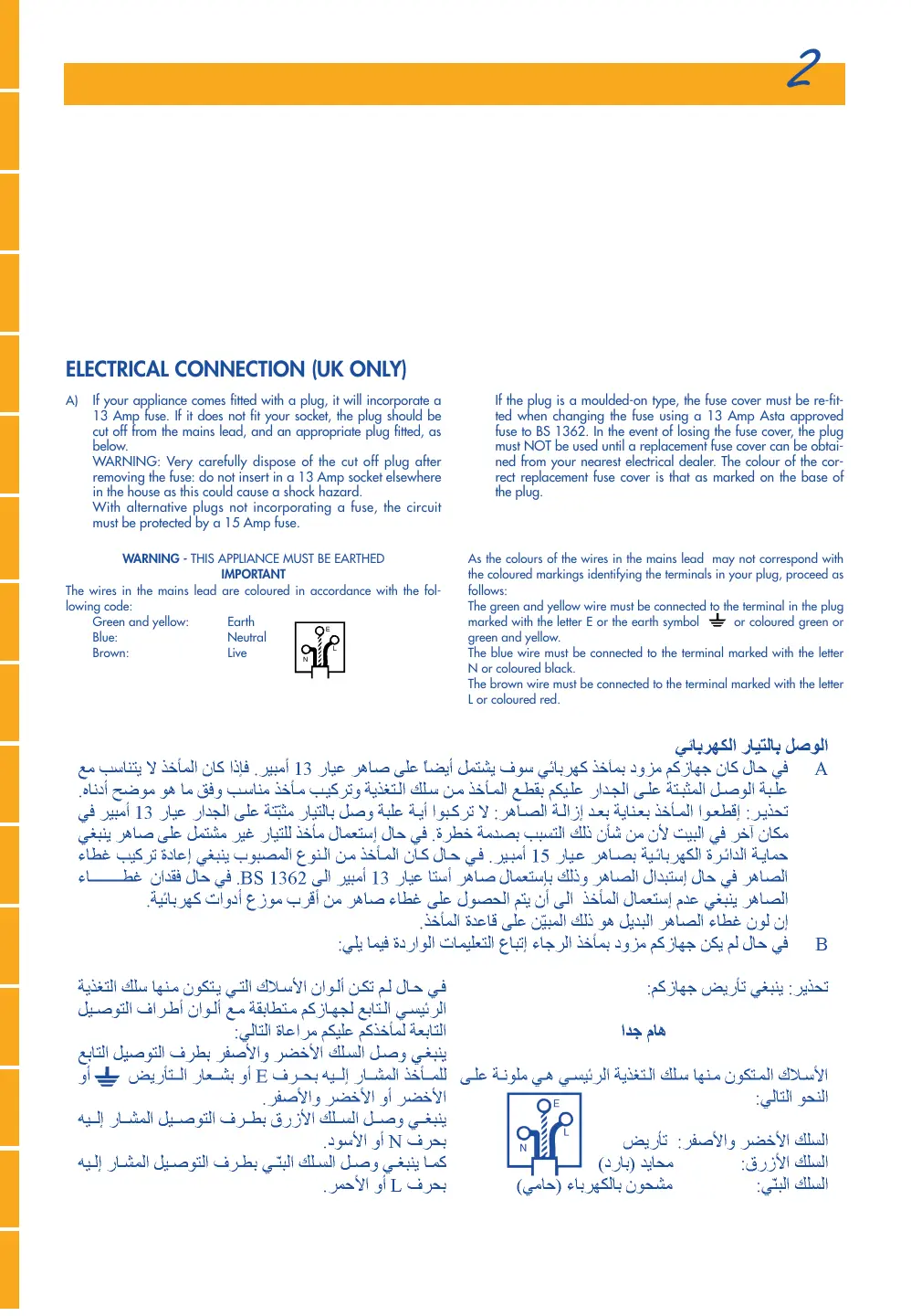 ELECTRICAL CONNECTION (UK ONLY) If your appliance comes fitted with a plug, it will incorporate a 13 Amp fuse. If it does not fit your socket, the plug should be cut off from the mains lead, and an appropriate plug fitted, as below.