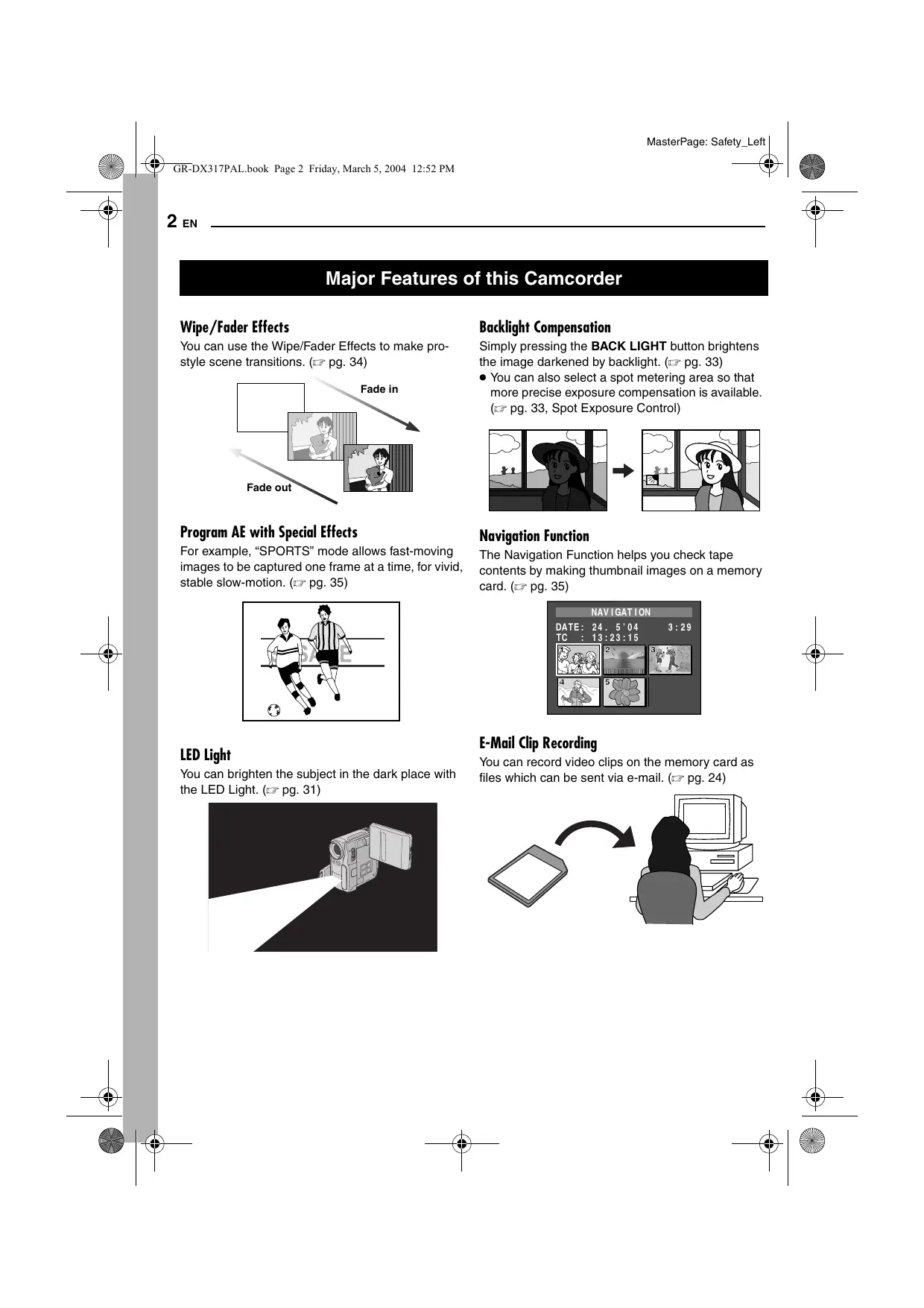 a) de. 2 EN T Wipe/Fader Effects Backlight Compensation You can use the Wipe/Fader Effects to make pro- Simply pressing the BACK LIGHT button brightens style scene transitions. (cr pg. 34) the image darkened by backlight. (-7 pg. 33) : e You can also select a spot metering area so that Fade in more precise exposure compensation is available. 4 SR € pg. 33, Spot Exposure Control) . M | PUR Program AE with Special Effects Navigation Function For example, “SPORTS” mode allows fast-moving The Navigation Function helps you check tape images to be captured one frame at a time, for vivid, contents by making thumbnail images on a memory stable slow-motion. (+7 pg. 35) card. (+7 pg. 35) NAVIGATION