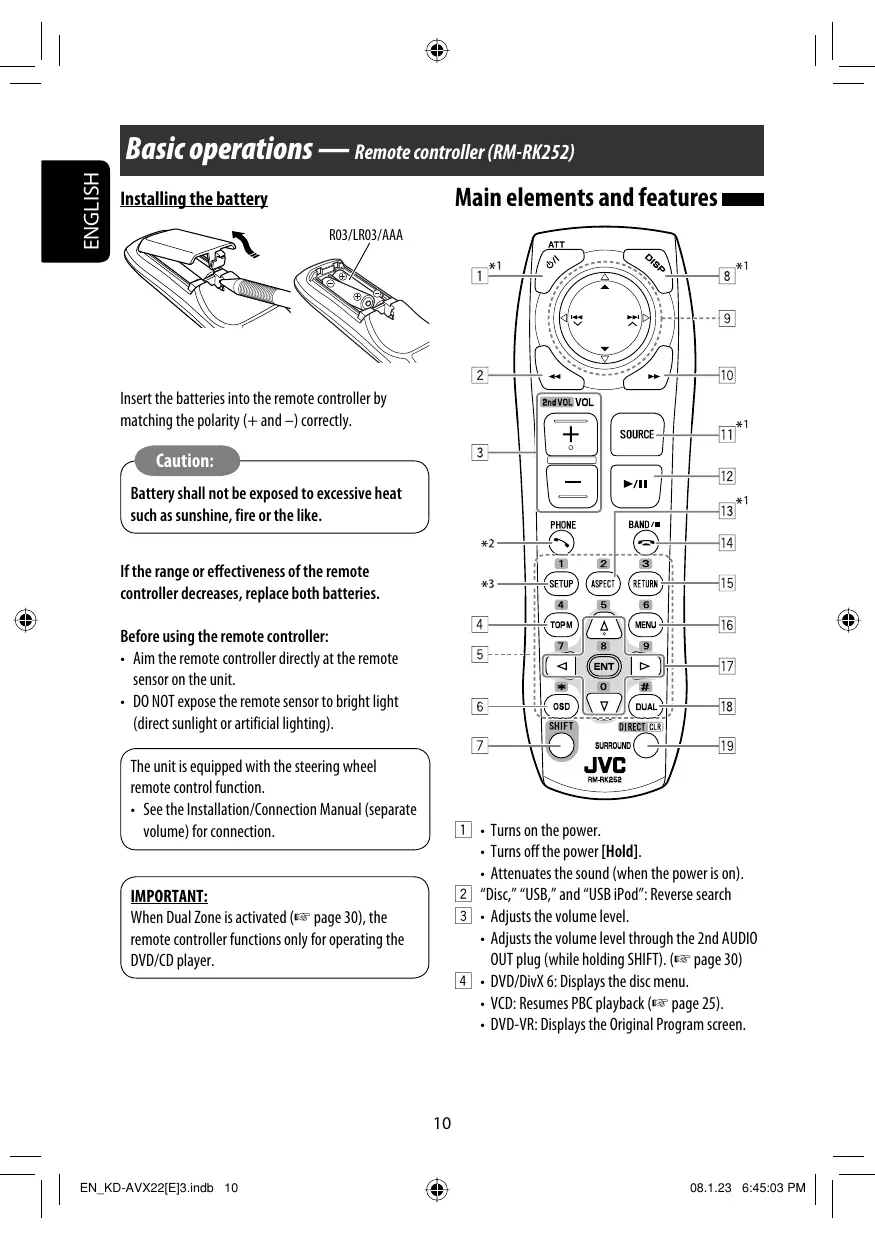 ENGLISH Basic operations — Remote controller (RM-RK252) Main elements and features Installing the battery