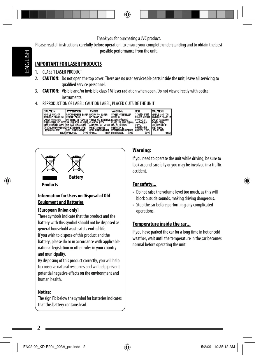 ENGLISH aumen —TaTemon [SO DANS TEE faunon Lseue moon à lvomeuer uses oucen user (nus cemeun |Ecenc eme [ieue moyen use cuss ou MALE DeCUeeu ou Laneren [neue cu LEE BNP de cu RE Ye rummucimequune 973 USE oiten Pepe eme See Lam, Mu La Go. (Ses LoRorepe lorecnivevre ler E: esta | (oran, RUE oem |Renecegu, l'RR 2 ro. "Es perte. Be) El me Enr If you need to operate the unit while driving, be sure to Look around carefuly or you may be involved in a traffic accident. == try N & Products For safety. & information for Users on Disposal of OI + Do notraise the volume level too much, as this will Information for Users on Disposal of Old block outside sounds, making driving dangerous. Equipment and Batteries 2 Stop the car before performing any complicated European Union only] operations. These symbol indicate that the product and the battery with this symbol should notbe disposedas | Temperature inside the ca general household waste at end. If you have parked the car for long time in hot or cold If you wish to dispose of this product and the ‘ . weather, wait until the temperature in the car becomes battery, please do soin accordance with applicable \ normal before operating the unit. national legislation or other rules in our country and munidpality. By disposing of this product correct, you will help to conserve natural resources and will help prevent potential negative effects on the environment and human health. Notice: The ign Pb belou the symbol for batteries indicates that this battery contains lead