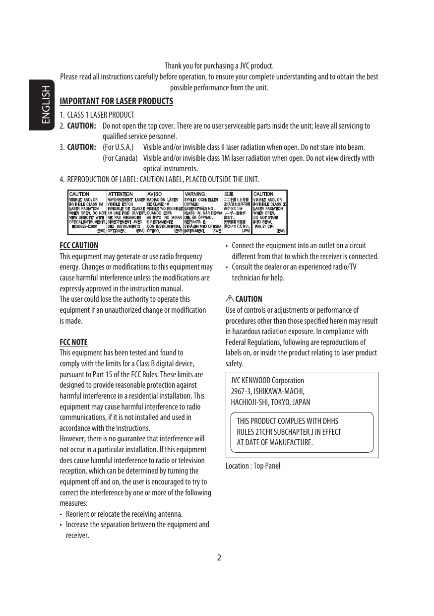 - Consult the dealer or an experienced radio/TV technician for help. FCC CAUTION This equipment may generate or use radio frequency energy. Changes or modifications to this equipment may cause harmful interference unless the modifications are expressly approved in the instruction manual. The user could lose the authority to operate this equipment if an unauthorized change or modification is made. CAUTION Use of controls or adjustments or performance of procedures other than those specified herein may result in hazardous radiation exposure. In compliance with Federal Regulations, following are reproductions of labels on, or inside the product relating to laser product safety. FCC NOTE This equipment has been tested and found to comply with the limits for a Class B digital device, pursuant to Part 15 of the FCC Rules. These limits are designed to provide reasonable protection against harmful interference in a residential installation. This equipment may cause harmful interference to radio communications, if it is not installed and used in accordance with the instructions. However, there is no guarantee that interference will not occur in a particular installation. If this equipment does cause harmful interference to radio or television reception, which can be determined by turning the equipment off and on, the user is encouraged to try to correct the interference by one or more of the following measures: