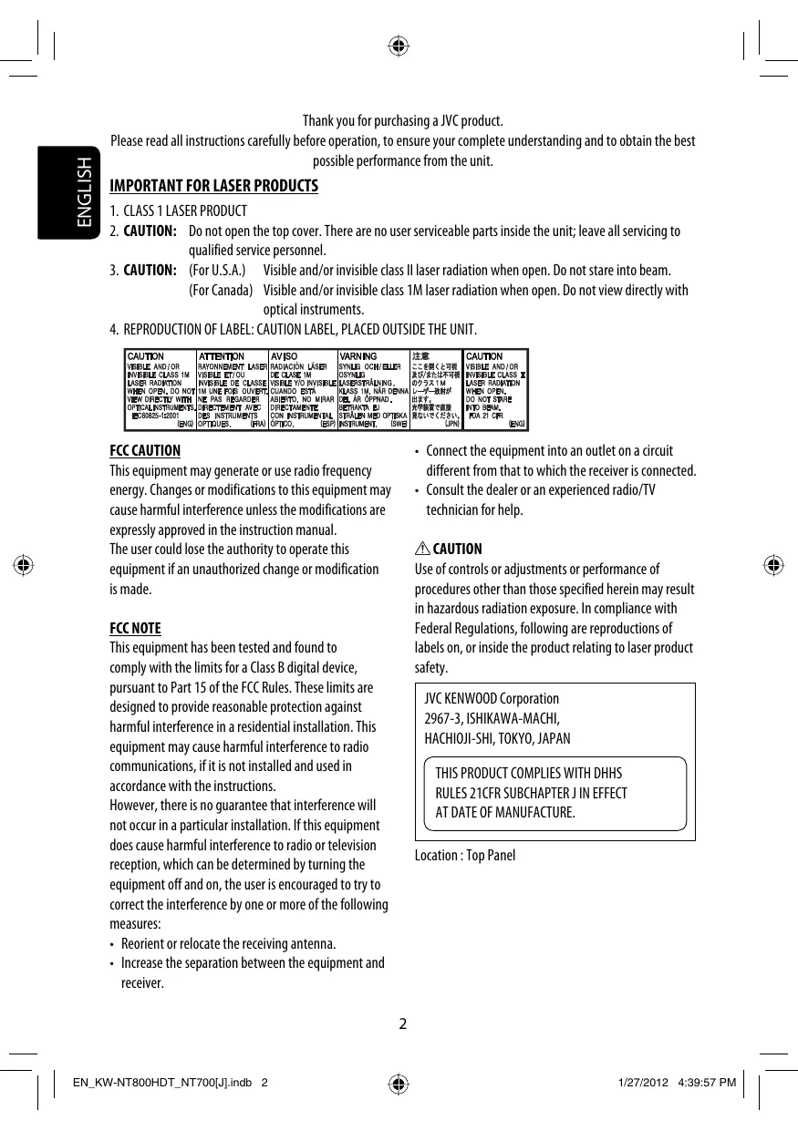 [J] Cover1_NT800HDT_NT700[J]_001A.in2 2 11/25/2011 10:57:42 AM ENGLISH Thank you for purchasing a JVC product. Please read all instructions carefully before operation, to ensure your complete understanding and to obtain the best possible performance from the unit.