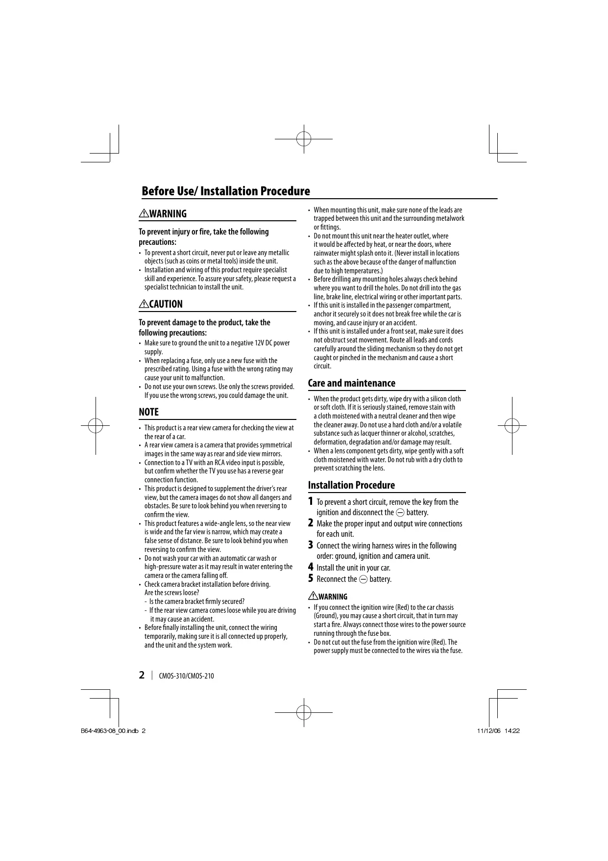 Record the serial number, found on the back of the unit, in the spaces designated on the warranty card, and in the space provided below. Refer to the model and serial numbers whenever you call upon your Kenwood dealer for information or service on the product. Model CMOS-310/CMOS-210 Serial number US Residence Only