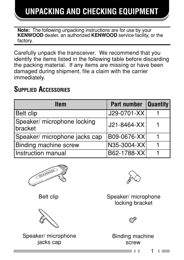 Note: The following unpacking instructions are for use by your KENWOOD dealer, an authorized KENWOOD service facility, or the factory. Carefully unpack the transceiver. We recommend that you identify the items listed in the following table before discarding the packing material. If any items are missing or have been damaged during shipment, file a claim with the carrier immediately. SUPPLIED ACCESSORIES Item Part number Quantity J29-0701-XX