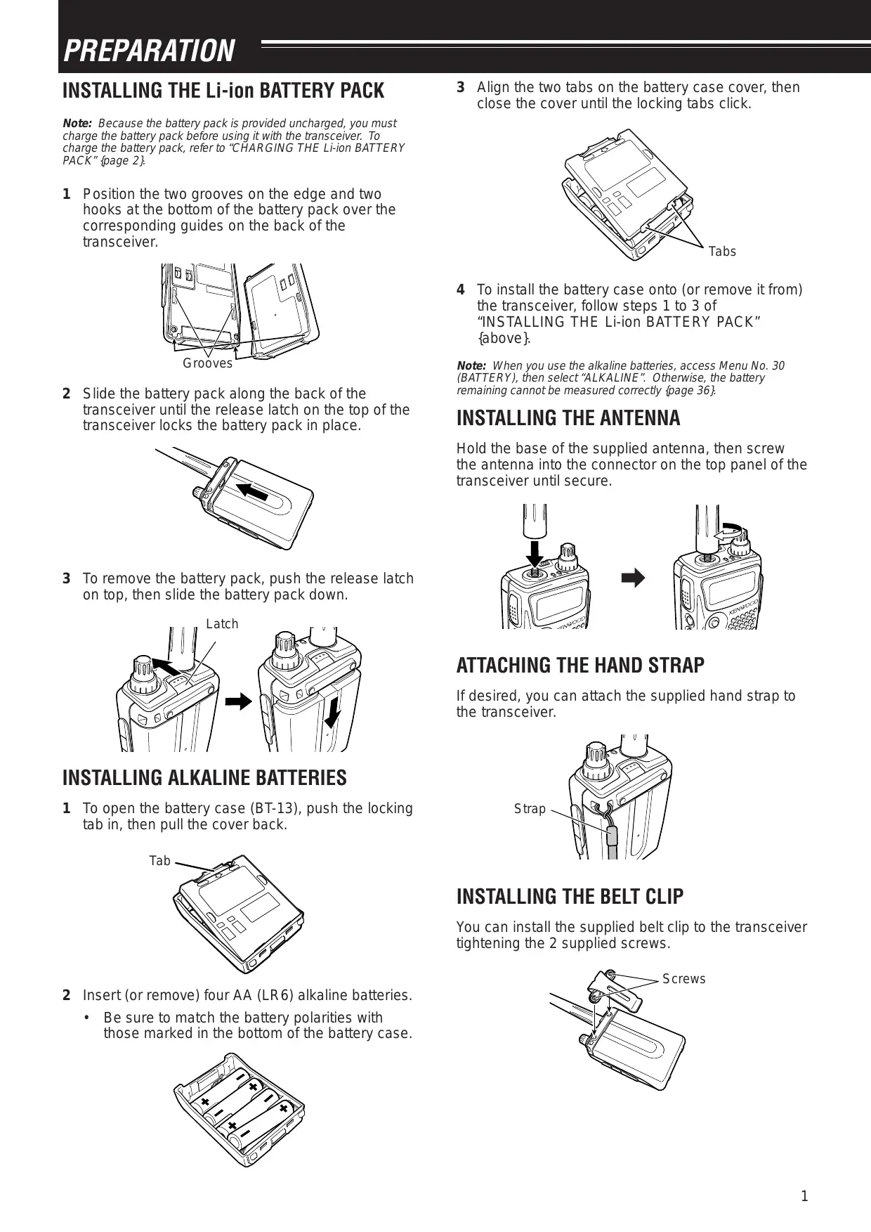 - Be sure to match the battery polarities with those marked in the bottom of the battery case. 3 Align the two tabs on the battery case cover, then close the cover until the locking tabs click. 4 Toinstall the battery case onto (or remove it from) the transceiver, follow steps 1 to 3 of “INSTALLING THE Li-ion BATTERY PACK” {above} Note: When you use the alkaline batteries, access Menu No. 30 (BATTERY), then select ‘ALKALINE". Otherwise, the battery remaining cannot be measured correct {page 36)