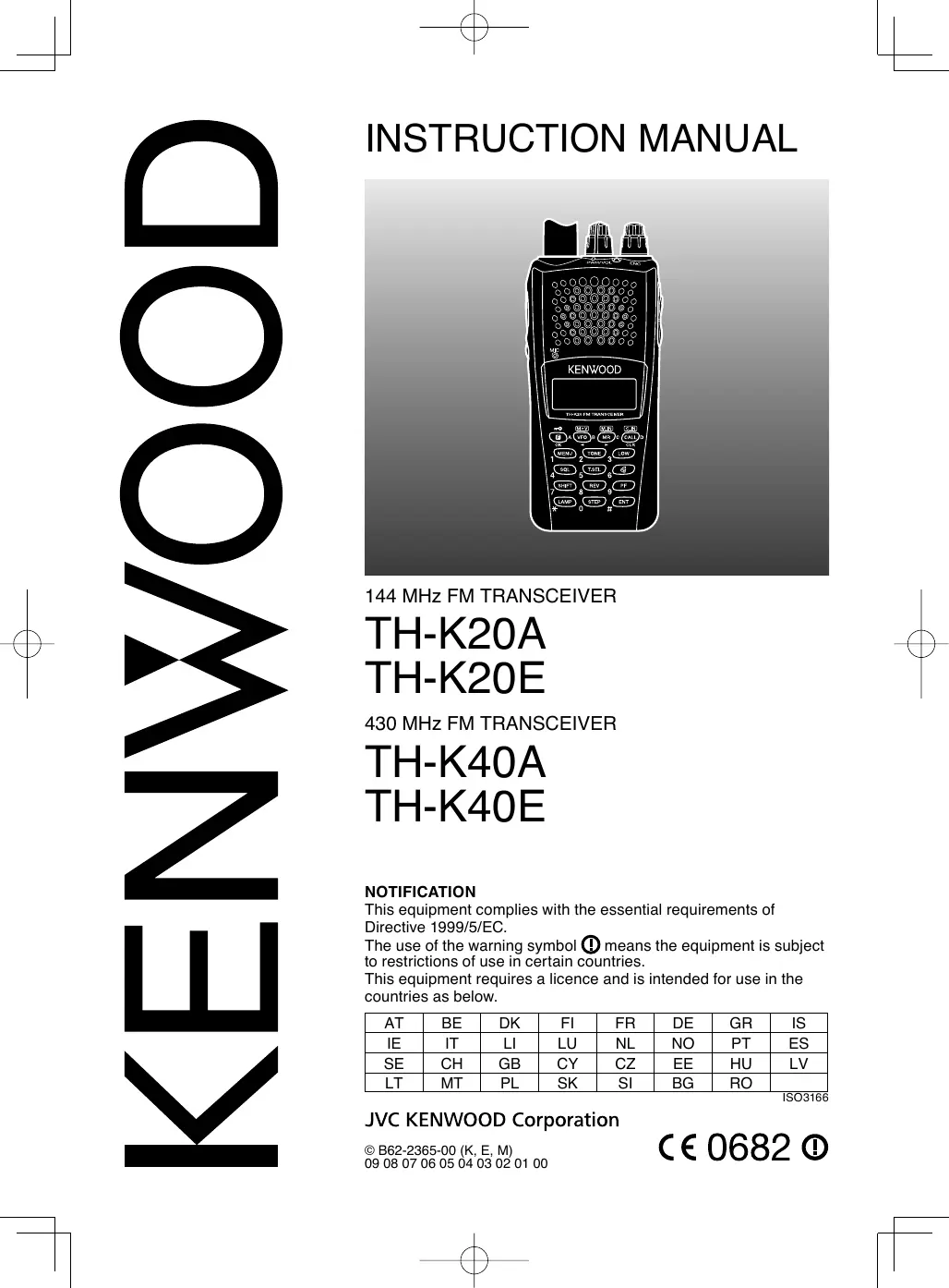 INSTRUCTION MANUAL 144 MHz FM TRANSCEIVER TH-K20A TH-K20E 430 MHz FM TRANSCEIVER TH-K40A TH-K40E NOTIFICATION This equipment complies with the essential requirements of Directive 1999/5/EC. The use of the warning symbol (D means the equipment is subject to restrictions of use in certain countries. This equipment requires a licence and is intended for use in the countries as below.