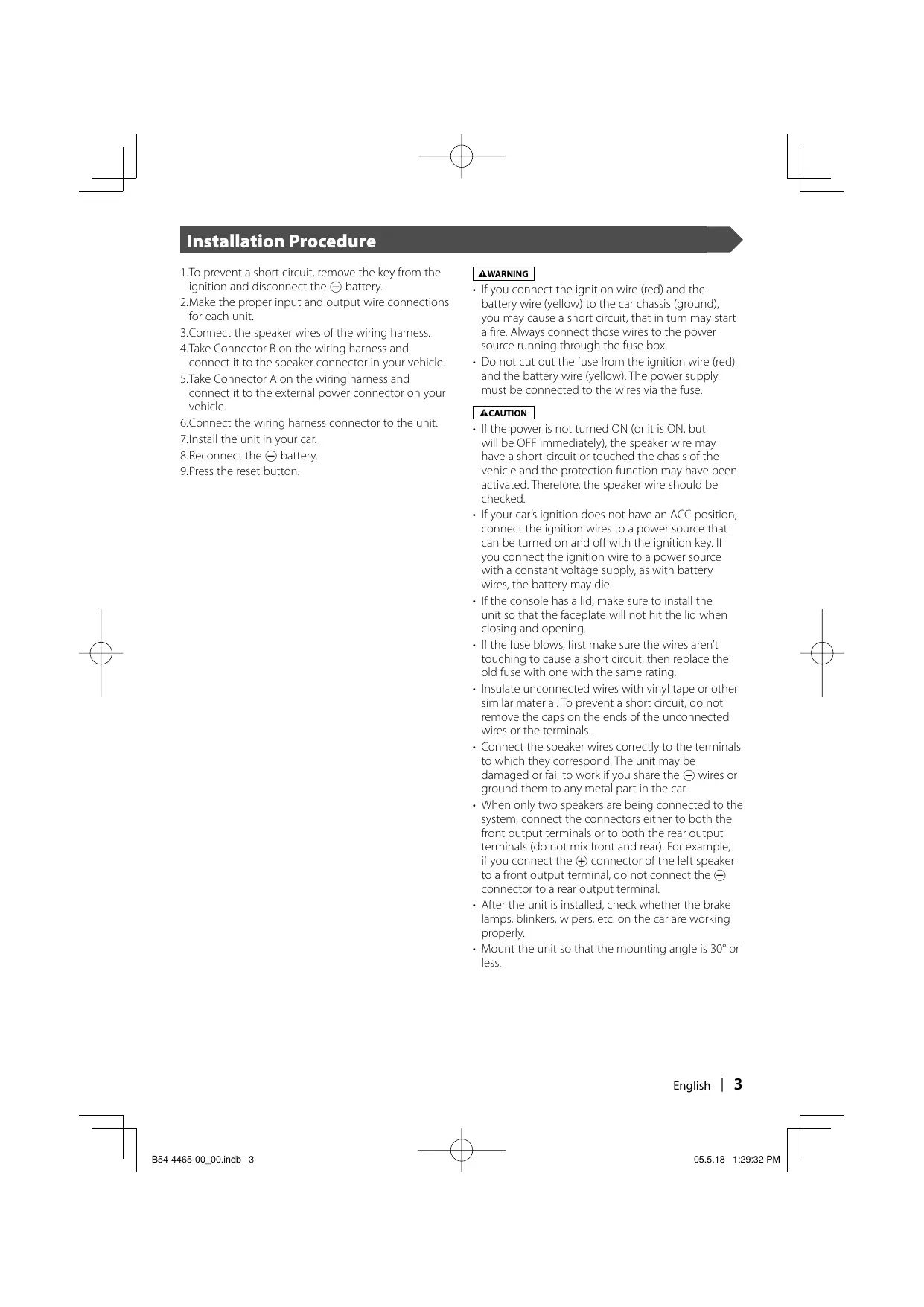 Ground wire (Black) ç ess B me — Connector A \\ If you connect the ignition wire (red) and the battery wire (yellow) to the car chassis (ground), you may cause a short circuit, that in turn may start a fire. Always connect those wires to the power source running through the fuse box. Battery wire (Yellow E Connector B Ground wire (Black) © (To car chassis) English | 5 B54-4465-00_00.ndb 5 a 05.518 1:29:34 PM